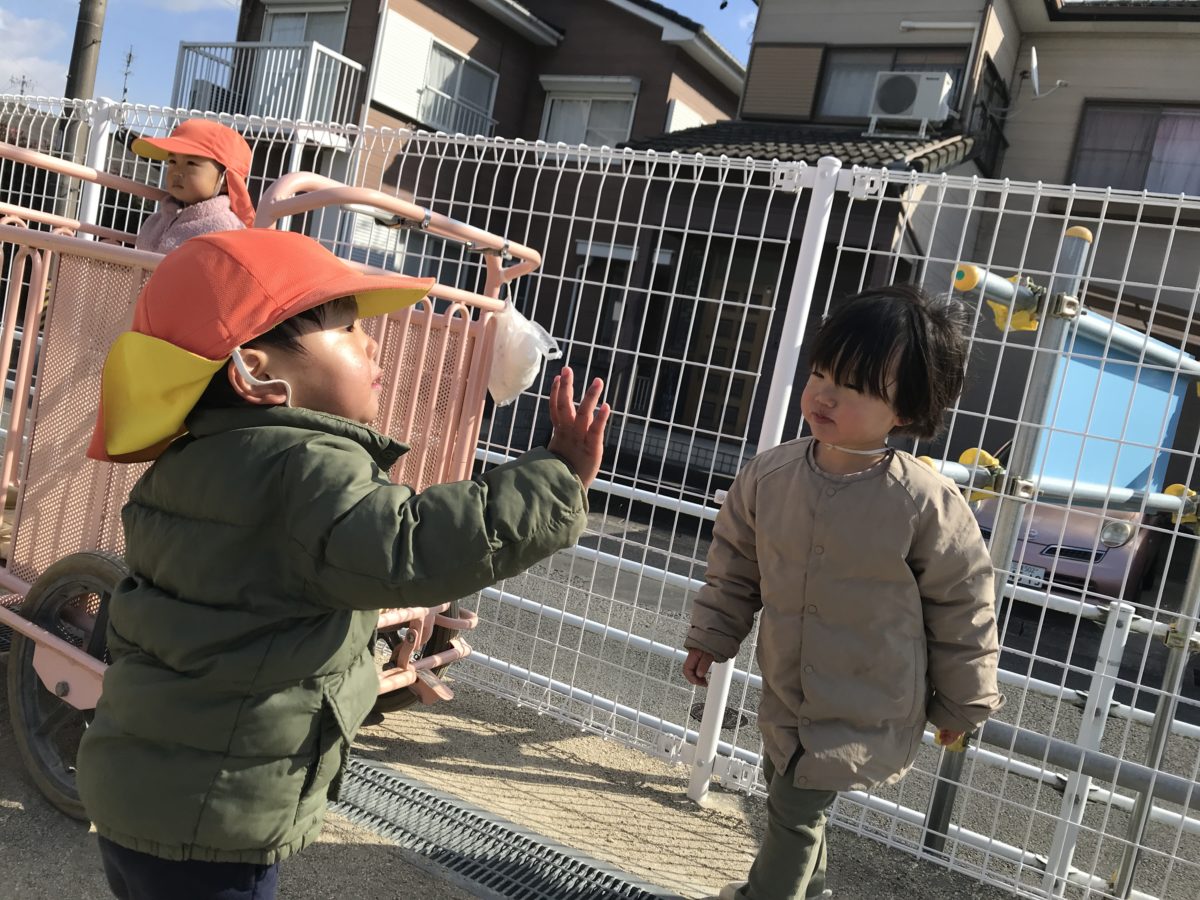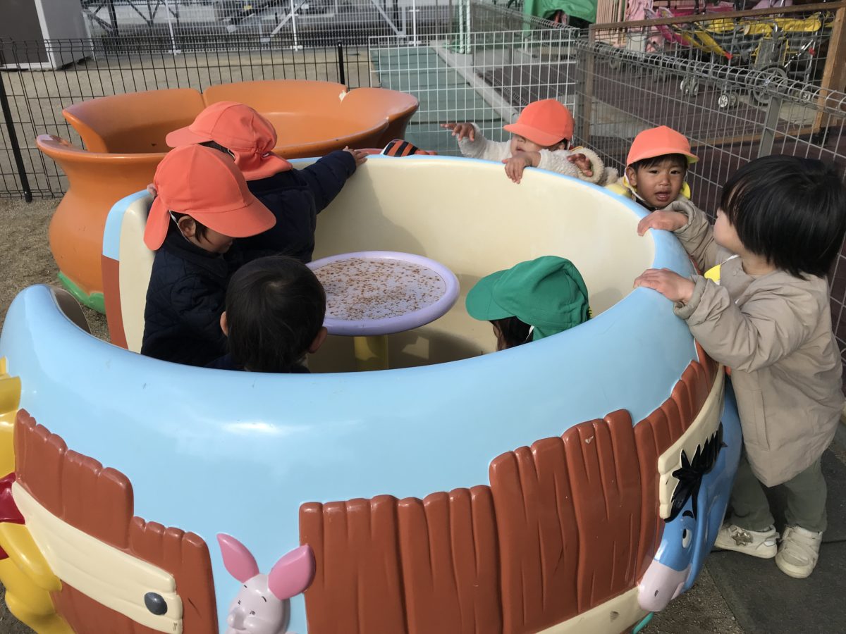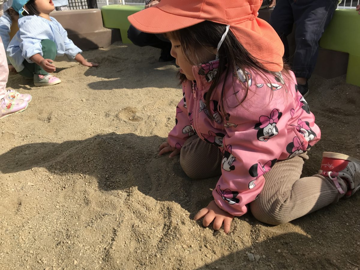 テラスに出て遊んでいたお友だち。すいか組さんはいちご組のお姉さんのようにバランスボールに乗ろうとしている隣でいちご組さんもどうやって乗るのかな?と見ている姿もありました。園庭で遊んでいたお友だちは、回転式遊具に乗る人と回す人で分かれて回している子たちは「せーの!」と声を上げてみんなで協力して回していたり、誰かが乗るとみんなで一斉に乗っている姿がありました。広い園庭に出て遊んでいたお友だちは、砂場に行き、山を作ろうと砂を集めて三角に形を整えながら作っていました。お友だちにも「これー!」と言いながら一緒に作ろうと誘っている姿もあり、一か所にみんなで集めていました。一緒に出ていたお友だちは、「よーいどん!」と園庭の端から端まで全力で走り何度も繰り返していると、ヘリコプターの音が聞こえてきて「どこどこ?」と探して見つけると「あったー!」「そこ!」と空を指さしてお友だちに知らせてみんなでヘリコプターに向かって「バイバーイ!」と手を振っていました。