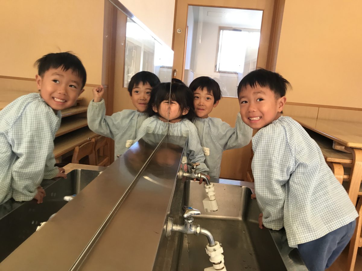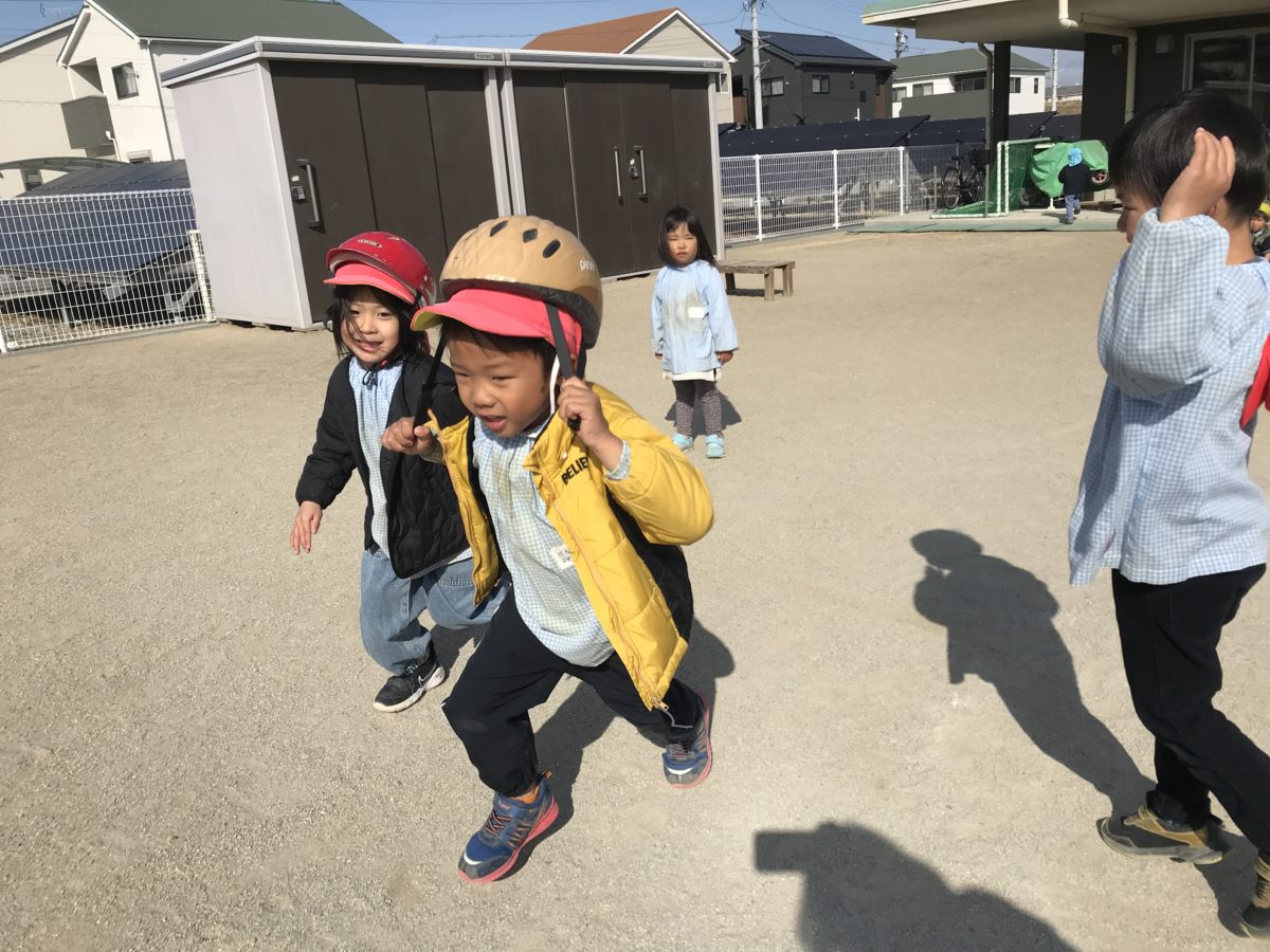 今日は「リレーしたーい!」「はしりたいきぶん!」と言うのでヘルメットがバトン替わり、ヘルメットリレーをしました。ヘルメットをかぶって、走って、脱いで渡して・・・と大忙しのリレーでした。きちんとルールを決めて、そのルールをお友だちと確認しながら、「ヘルメットのカチッとしやなアカンよな?」「え?頭入らん。」「入らんのはしゃーないよな!」と話しながらスタート。ヘルメットのカチッとする部分が自分ではできない子を周りで見ていた同じチームのお友だちが止めてあげたり、途中で「負けているから悔しい。」と泣いて止まってしまったお友だちを気遣い、「だいじょうぶだから一緒に差後まで行こう?」と声をかけている子がいたりして、お友だちの気持ちに寄り添いながら、一緒に頑張ろうとする姿が見られたりして、とても感心しました。結果は負けてしまっても、悔しくて「もういっかい勝負!」と話していて次への意欲も見られました。