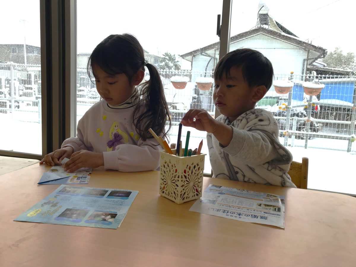 雪遊びを終えた後は、ブロックや折り紙・パズルなどそれぞれが好きな遊びに集中して取り組んでいます。中でも真剣に遊んでいたのが折り紙。「おりがみしたいの」と一人のお友だちの声から始まった折り紙遊びですが、はじめは思うように折れなくて苦戦しています。「これどうするの?」と何度も、大きいお友だちに聞きながら、折っては開いてを繰り返しながら折り方を少しずつ覚えていました。「こうかな?」と試行錯誤しながら、紙飛行機が完成!「できたよ!」と一生懸命考えながら作った紙飛行機を嬉しそうに眺めてみたり、飛ばしたりしながら遊んでいました。