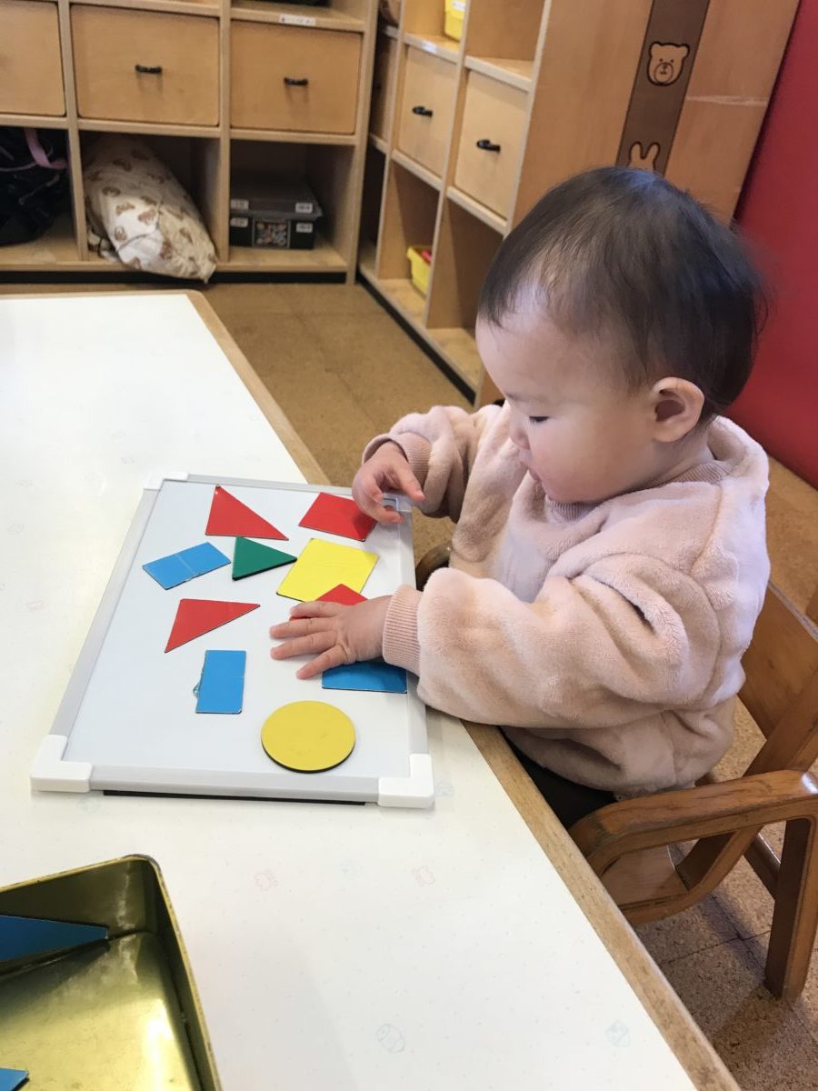 色々なパズルに挑戦するいちご組さん。「きいろ!ここだよ!」と少し難しい電車のパズルも、ピースと台紙の色を見比べながら一つ一つ色々な角度で試しながらはめていきます。ピースがピッタリ合うと「みて!あっとるよ!」と嬉しそうにお友だちに見せて話す姿がありました。