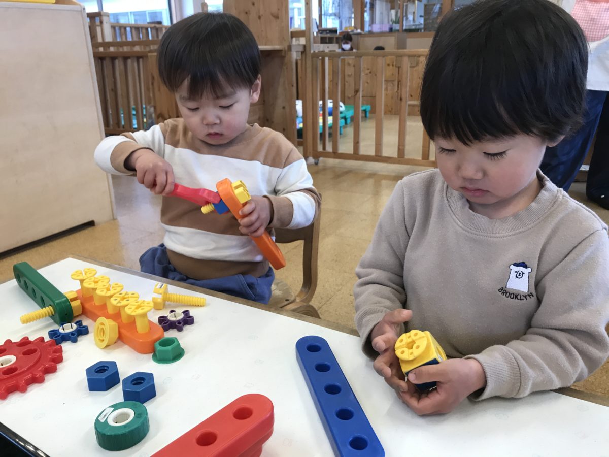 工具のおもちゃに夢中のお友だちは、色々な道具を使ってネジやナットを回したり、四角や丸を組み合わせてくっつけたり、くぎをコンコンコンと打ったりとっても真剣な表情で楽しんでいました。