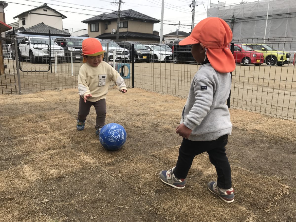 「いくよー!キックー!」とお友だちとボールをパスし合っていました。
