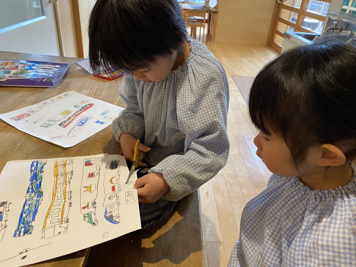 昨日、すごい!て褒められた!頑張っとったって!と昨日の発表会の話しをお友だちと楽しみ、嬉しい気持ちが溢れていました。園庭の畑の芽キャベツが成長し葉が重なってきていましたが、残念ながらうんちされていました。その写真を置いておくとキャベツができてきとる!と気付くと共にうんちの存在にも気付き、「えっ、うんち、あるやん・・」「むしのじゃない?」「みにいこう!」と園庭に見に行っていました。しかし実際見てみると写真で想像したよりも大きく、これはむし・・・じゃない!!えっ、なに?とイヌやネコかな?と想像していました。にんげんではないねっとユニークな声も聞こえていました。お友だちと一緒に観察を楽しんでいました。また発表会を終えて本番用のベルの片づけを積極的に行う素敵な姿がありました。たくさんのベルをふくろづめ、種類別にして分けて箱にしまって…その作業からサンタさんやたくさんのプレゼントをイメージしたようで「サンタさんのおしごとみたい!」「いそがしい!」「こんなおしごとありそう!」とユニークに話していました。