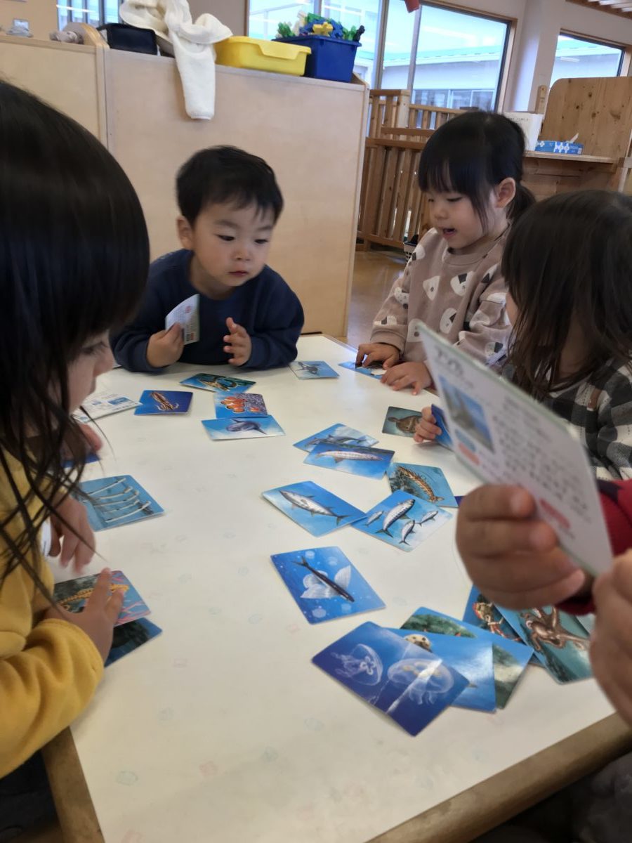 本の後は魚のカードで遊びました。「これペンギンや!」「こっちはカメさん!」知っている海の生き物を一生懸命に探していました。