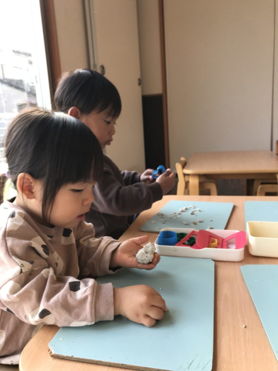 粘土遊びでは小さく切ったり丸めたり楽しそうでしたよ。最後には大きなお団子を作って『ケーキだよ』と見せてくれました。素敵な物ができましたね。