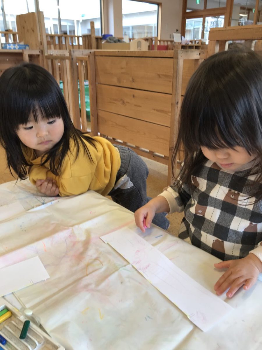 海の仲間がたくさんいる絵本に興味を示し、お友だちが集まってきて「くじらさんだ!」「カメさんだ!」「こっちはアシカさん?」などとお友だち同士でお話を楽しそうにしていましたよ。また、数え切れないくらいのさかなを見て一生懸命に1・2・3・4・5・・・と根気よく数えていました。そこに、すいか組のお友だちも仲間に入って一緒に指さして数えていました。その姿がとても可愛らしかったです。その後は、海の生き物のカードを見たり、お絵描きしたり、玄関先の水槽を見に行ったりしました。そこで、敷いてあったマットにも魚がたくさん載っていました。自分たちで発見してとても嬉しそうでした。