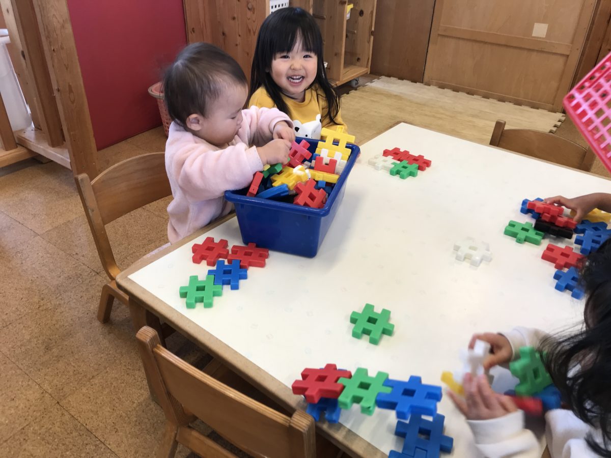たくさんのブロックでお友だちと遊んだ後は一生懸命お片付けしてくれていますよ。