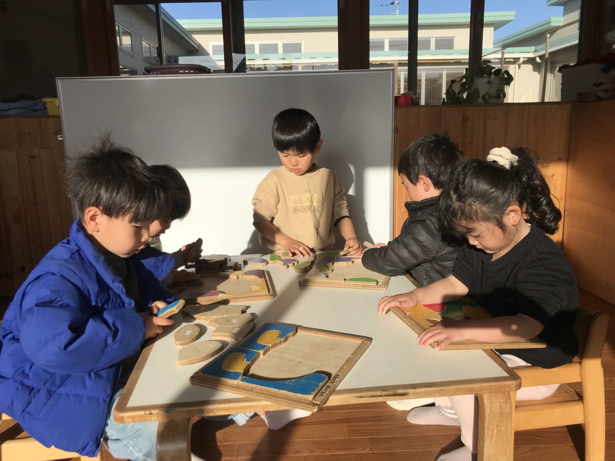 「かめのやつにする!」「ぼくいちばんにできた!」とパズルに夢中!