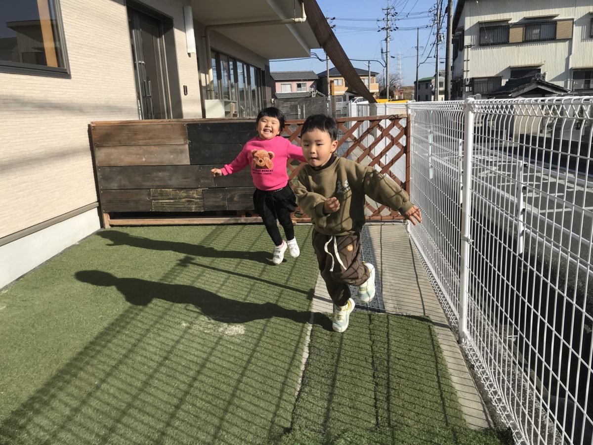 登園しシール貼りをお友だちとしていると「みてー!こことここおなじシールだね」「きょうもおにのシールいっしょにしよ!」と会話を弾ませていました。準備が終わると保育士が畳んでいたタオルやビブスの洗濯物に興味津々!「ぼくもやりたい!」「ビブスのやつまえやったことある!」「こっちしたい!」と率先してお手伝いをする姿がありました。大きい子は「ばんごうじゅんになるように・・」「つぎは〇ばんのやつ!」と一枚一枚広げながら番号を確認し畳む様子があり、小さい子もその姿をみて端っこと端っこを合わせるように丁寧に畳んでいました。園庭ではスキップに挑戦している子ども達!「ぼくスキップできるよ!みて!」とみんなの前で披露!周りにいたお友だちも「わたしもできる!」「スキップかけっこしよ!」「よーいどん!」とみんなでスキップをして楽しんでいました。また、テラスではブロックを使ってなにやら作っている様子・・・。「こうやって・・できた!」「みて!サイコロ!」「ぼくもつくりたい!」とみんなで同じサイコロを作っていました。みんなのサイコロが完成すると「みんなおなじいろになるかな?」「せーのでころがしてみよ!」「せーの!」「あ、そろわんかった・・」「もっかいしよ!」「つぎはふたついっしょになった!」「けどなかなかぜんぶいっしょにならんな~」と少し苦戦しながらもみんなのサイコロの色が揃うまで何度も挑戦していました。
