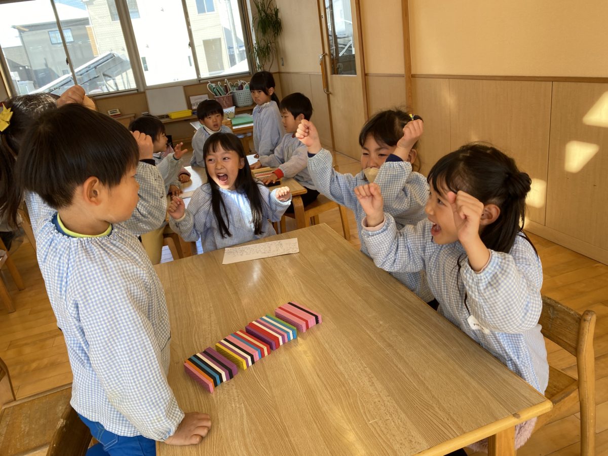 今日は来週のお別れ遠足を楽しみにする声が聞こえたので、水族館にいそうないきものってなーんだ!?とみんなで考えてみました。その後はその書いたものから食べれそうなものはなーんだ!?とも考えてみました。優勝チームの発表後は元気なガッツポーズが見られました。