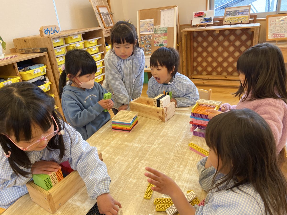 「こんなのできちゃった!」思い思いの積み木の作品が作られながら遊びが盛り上がる元気な声が聞こえていました。