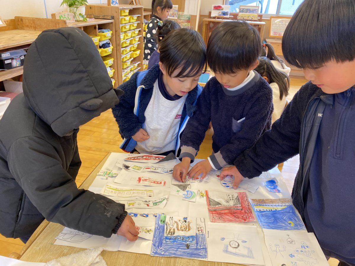 昨日のお友だちが描いた素敵な絵と一緒に他のみんなの絵も一緒にならべよう!とたくさんの素敵な絵が並んでいました。「これは〇〇くんの!」と友だちの作品を探したり「ここにはおおあたりっていれちゃお!」とアイデアあふれる声も聞こえていました。