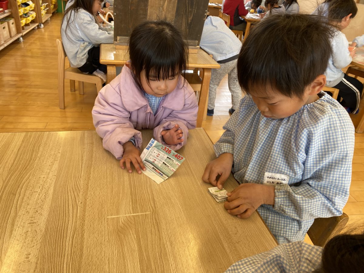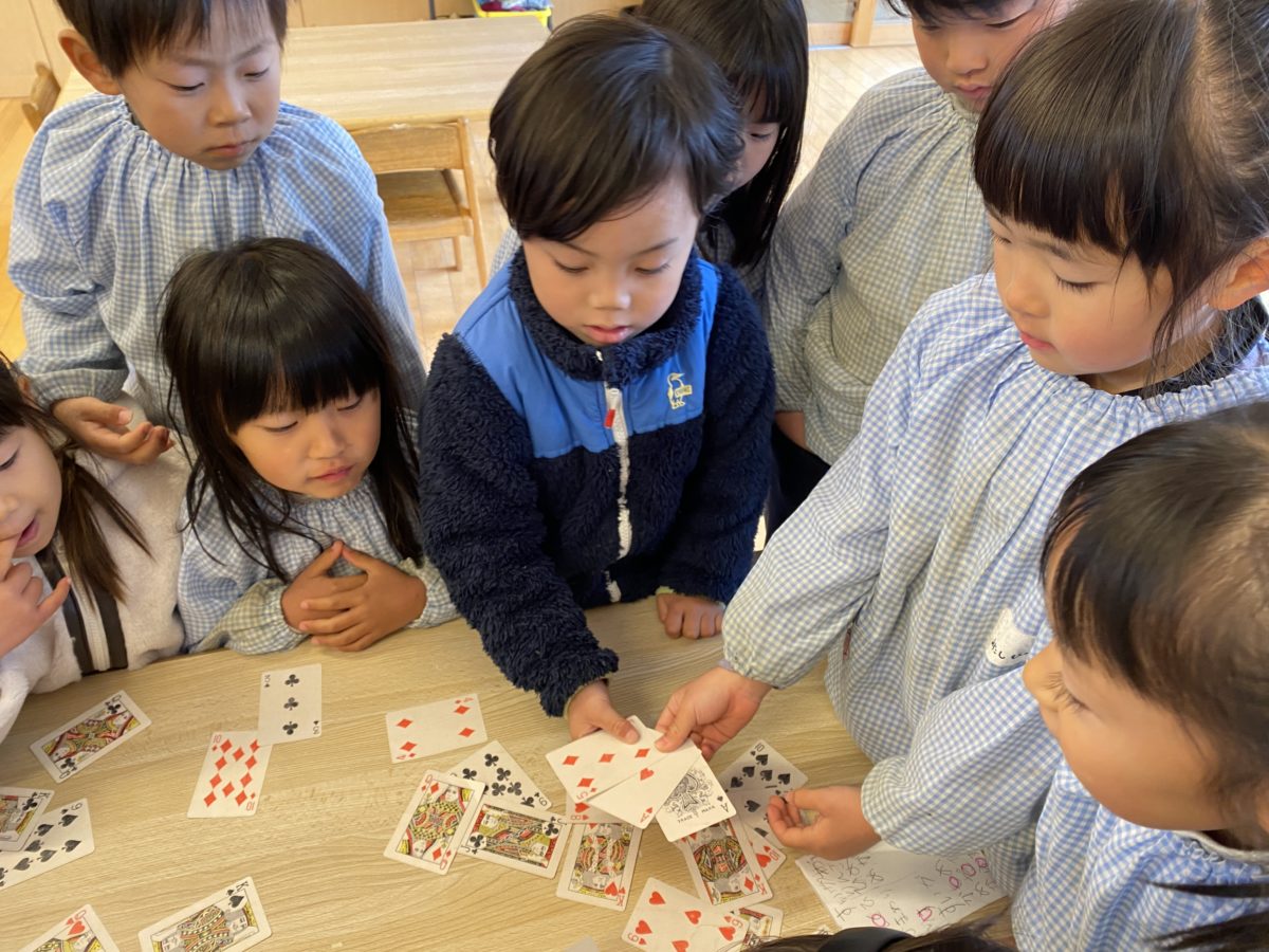 グループでしりとり合戦を楽しんだ後は、自分のチームの得点をお金の両替ではなくトランプの両替をして、数遊びを楽しみました。「もういっこ1をたしたら、10になる!」お友だちとアイデアを出し合って計算していました。
