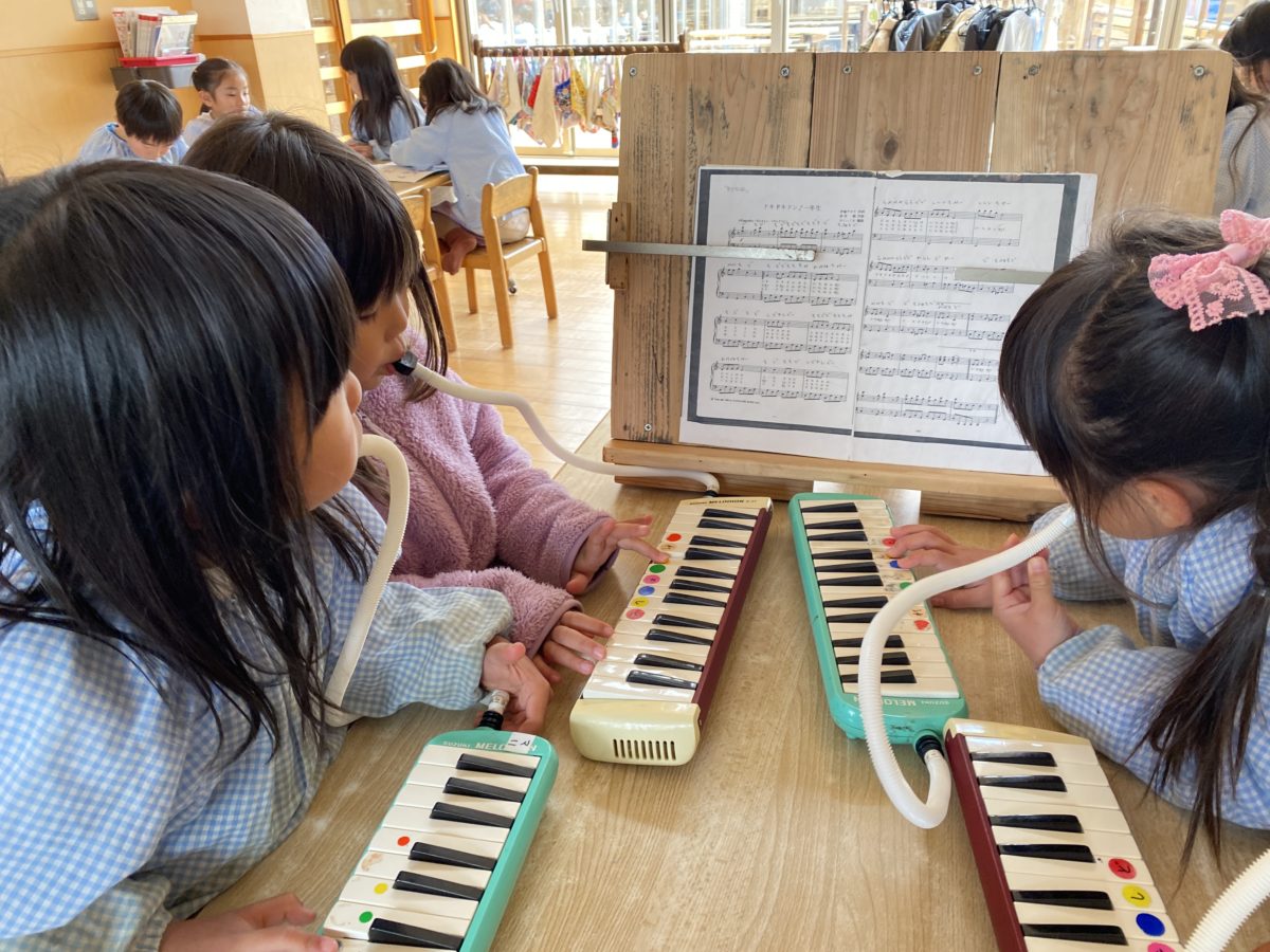 みんなで楽譜を見ながら、最近の大好きな歌「ドキドキドンいちねんせい」に挑戦中です。