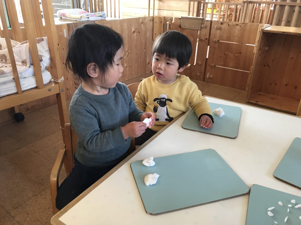 お部屋と園庭に分かれて遊んでいたお友だち。お部屋で粘土をしていたお友だちは、何を作ろうかなと粘土をこねているとお友だちに「しょうぼうしゃ?」「きゅうきゅうしゃ?」と聞いて作っていると、「これきゅうきゅうしゃ!」とできた粘土を見せ合って楽しんでいる姿があり、思い思いの乗り物や食べ物を作っていました。ブロックで遊んでいたお友だちは、「これしょうぼうしゃの赤色!」と消防車の赤色を集めていました。