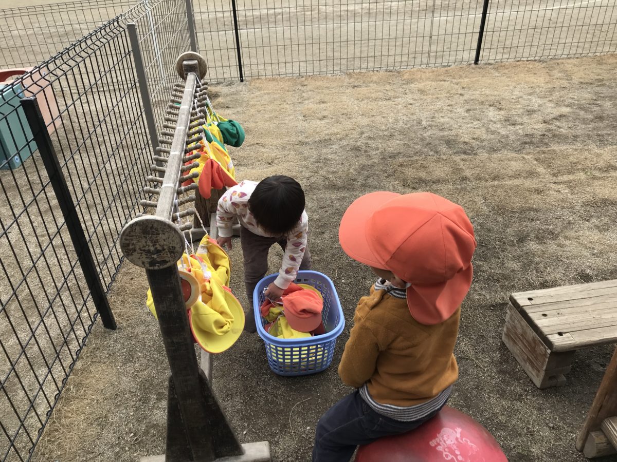 帽子を洗濯するために保育士がカゴを用意して帽子をかごに入れていくと一緒になってお手伝いをしてくれました。全部入ると「できたー!」とかごを渡してくれました。