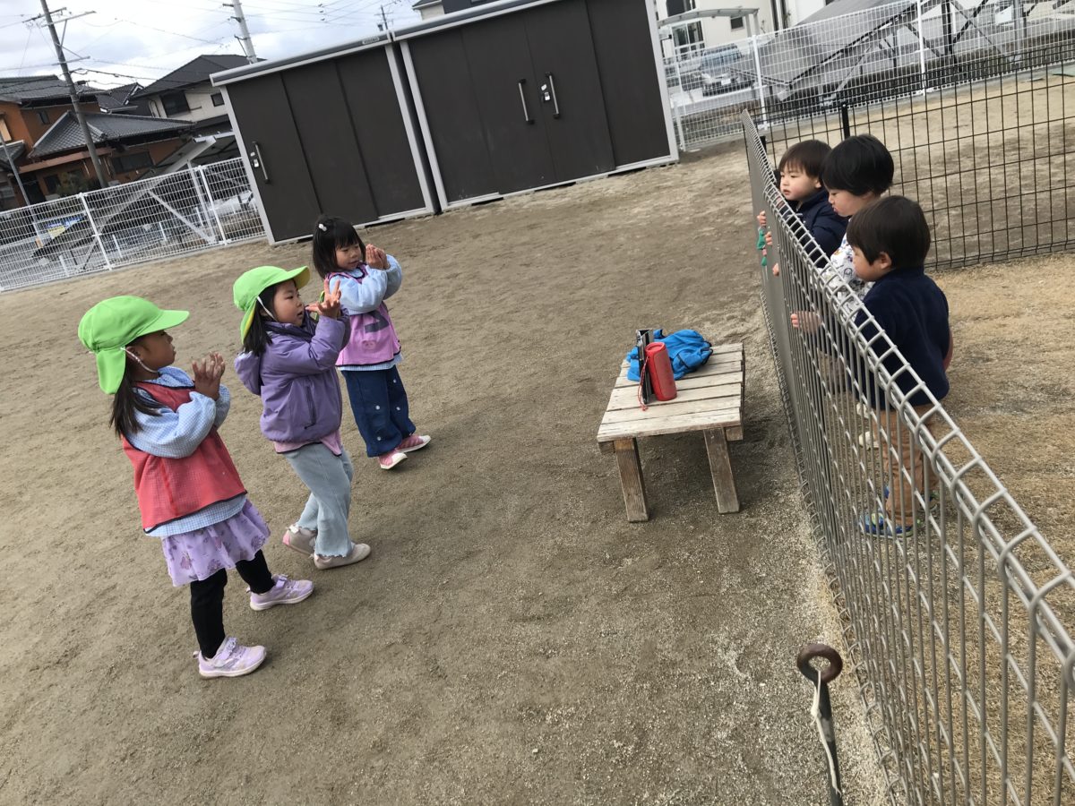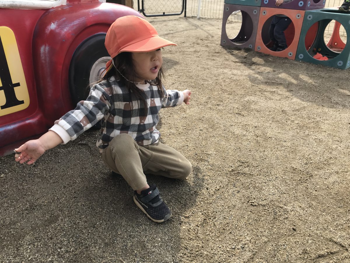 園庭で遊んでいたお友だちは、地面に石でお絵描きを始めると、「これねヘビなの!」「こーんなに大きいヘビ!」と手で大きさを教えてくれる姿がありました。