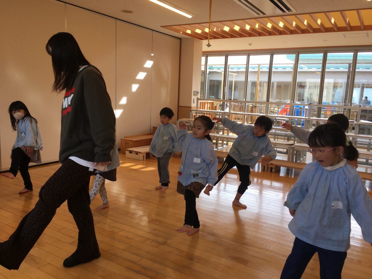 今日はポップコーンステップに挑戦! むずかしいー!と言いながらも先生のお手本をじっくり見ながら自分の足を動かしていました。