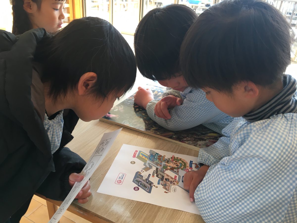 これでどこの地図だろう? アシカとかかいてあるねー。どこかなどこかな?でもペンギンともかいてあるからすいぞくかんかな?といろんな想像を膨らませていました。