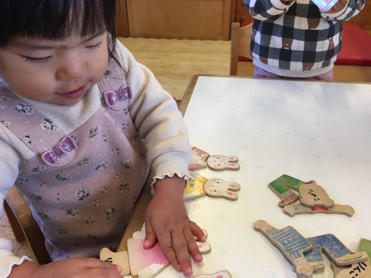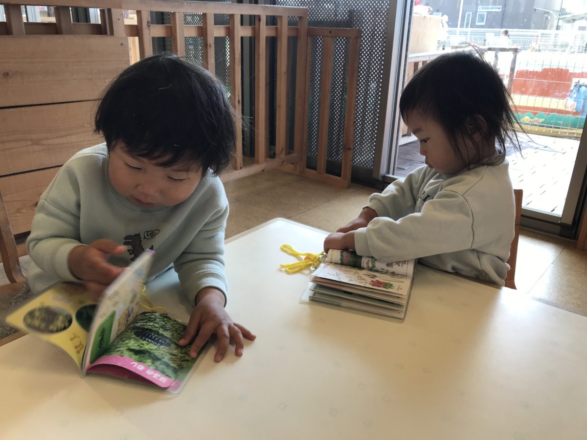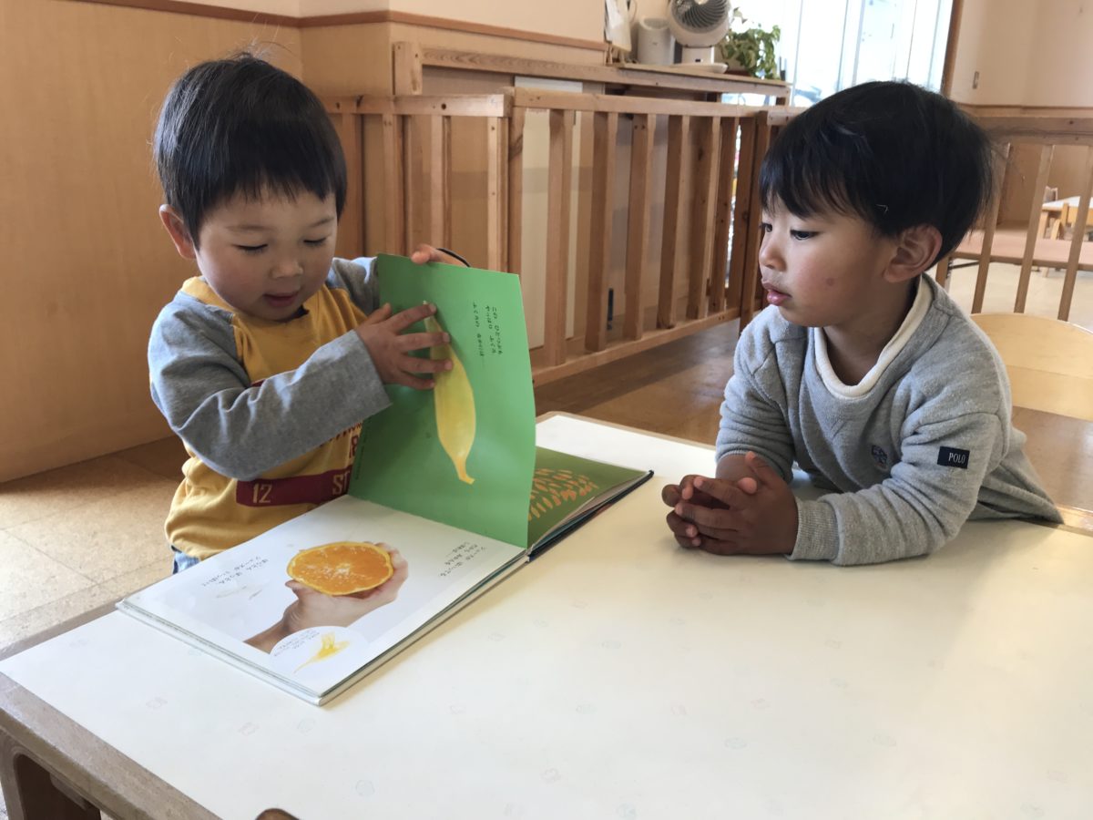 ミカンや季節の図鑑を見つけて興味津々のいちご組さん。「みて!ミカン!わ~!」と色々な種類のミカンの写真をじっくり見たり、皮がオレンジ色のものと緑のもの・皮を剥いてあるものなどのページを何度も行き来して見比べながら「あれ?みどり?」「ミカン?」とお友だちと話す姿がありました。季節の図鑑を見ていたお友だちは「ダンゴムシ!」「ちょーちょ!」と指をさしながら次々にページをめくって見ていました。図鑑のカバーが取れてしまったことに気づき、自分でつけ直そうと真剣な表情でカバーに図鑑の表紙を差し込んでうまく直せると嬉しそうに閉じて表紙をポンポンと触る姿がありました。