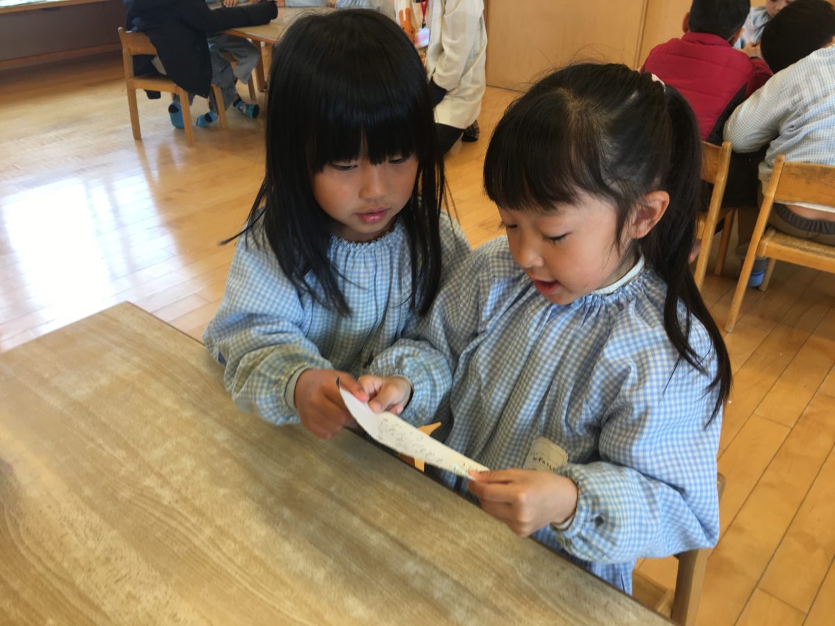 明日はみんなが楽しみにしているおわかれ遠足。そこで明日の集合時間を時計のおもちゃを使ってみんなでクイズをしました。「あしたは8じにしゅうごうだよ。」と楽しみなだけあり、きちんと知っていた子どもたち。「8じは、みじかいはりが8でながいはりが12!」「そうなん?ながいほうが8じゃないの?」とお友だちが言うと「ちがうちがう!それだと12じ40ぷんになっちゃうよー」と教える様子もありました。そのあとにグループごとに明日の持ち物を書き出してみました。グループごとにそれぞれ必要と感じているものは色々でしたが、どのチームも欠かさなかったのは…【おべんとうとすいとう】でした。そして中には「でざーとはぜったいにいる!」や「マスクもいるかな?すいぞくかんで、せきとかくしゃみしたらほかのひとにめいわくかかるとあかんもんな?」アイデアがたくさんあがりました。みんな想像を膨らませているときの表情もウキウキしていて楽しみにしている様子が感じられました。