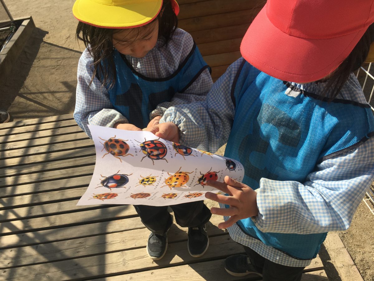 昨日、園庭で見つけたてんとう虫。てんとう虫の写真を用意すると「きのうのてんとうむしはどれだろう?」とたくさんてんとう虫が載っている中から、探し出そうと見ていると…「あっ!おったーこれこれ!」と見つけ出していました。すると虫に詳しい子が「あんなーテントウムシはあたたかくなったらでてくるんやで。はっぱのところとかに。」と教えている様子があり「きのうあたたかかったもんな。まって!きょうもあたたかいからおるんちゃう?」と外の温かさも感じながら「はたけみにいってみよ!」と畑まで一目散。そして畑の中を探し、「うーんきょうはおらんかな。たまごとかもないかな?」とテントウムシがいなければ、次へ期待をする子どもたち。「もしかして、これかな?なんかはっぱにきいろいのあったー。」と嬉しそうに話す子どもたち。「こんどみたらどうなってるかな?てんとうむしになってるかな?」と期待も膨らませている子どもたちでした。