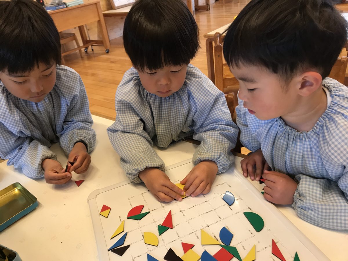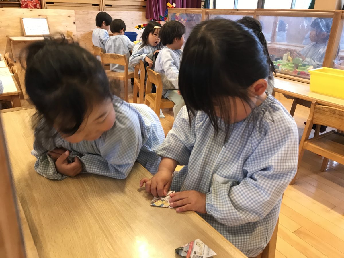 「昨日さ、お相撲テレビで見て~。」「お相撲さん作りたい!折り紙ください!」と言うので折り紙を用意しました。「でもさ、お相撲ってどうやって作るの?」と言っていたので作り方も用意すると、「あー!これで作れる!」と話しながらお相撲さん作りを楽しみました。作った後は初めは机に置いて「よーい、のこった!」と言ってトントンと机を叩いてみるのですが、作った紙相撲はピクリとも動かず。テッシュの箱が空になったので、テッシュの箱の裏で紙相撲を楽しみました。手のひらでトントンすると力が強すぎて紙相撲が跳んでいくので、「強くたたきすぎだよ~。」と友だち同士で話合い、人差し指を使ってトントンすることに。力加減も丁度いいようで、いよいよ試合開始。自分たちで「よーい、のこった!」の合図で紙相撲が始まり、勝負が決まると「やったー!」「あーー。」と喜びと落胆の声が両方聞こえてきて、一喜一憂しながらも楽しむ姿がありました。