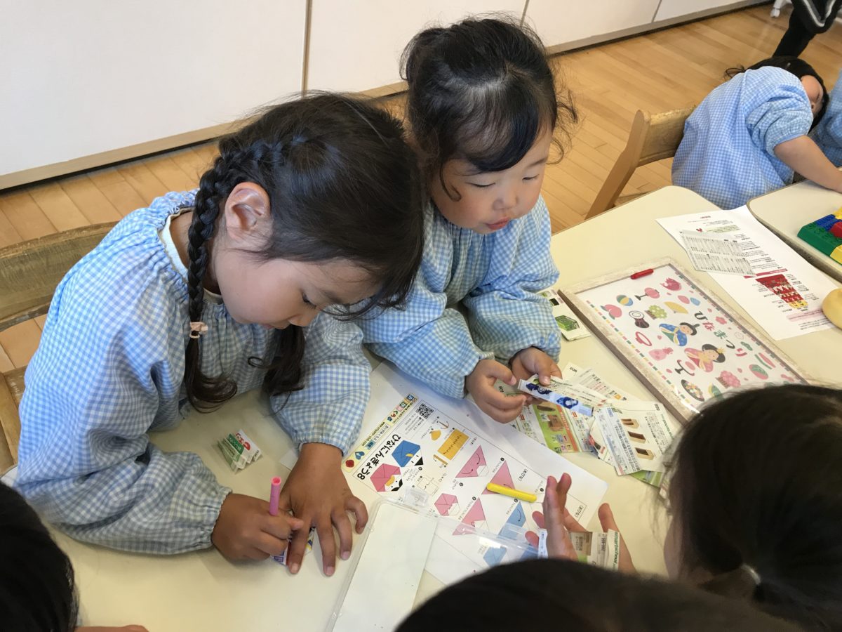 今日はあいにくの雨模様。外を見ながら「今日はお外に行けないね。」「なんで雨?」「いっぱい降るね~。」「お外に行きたいね~。」とテラスに降り続ける雨を見ながらお友だちとそんな会話を楽しんでいました。ひらがなの表と数字一覧を持って歩いていると、「お勉強やりたい!」と話すお友だちが居たので、勉強が出来るように机を配置したり、数字、ひらがなの表を置いて紙を用意すると紙いっぱいにひらがなと数字を書き、裏にもビッシリと書いていて、集中して取り組む姿がみえました。自分の名前のひらがなを探して、「これ名前!できたよ!」とお友だちに見せていたり、数字の表も用意してあったので、1から順番に50までの数字を紙いっぱいに書いたりもしていました。