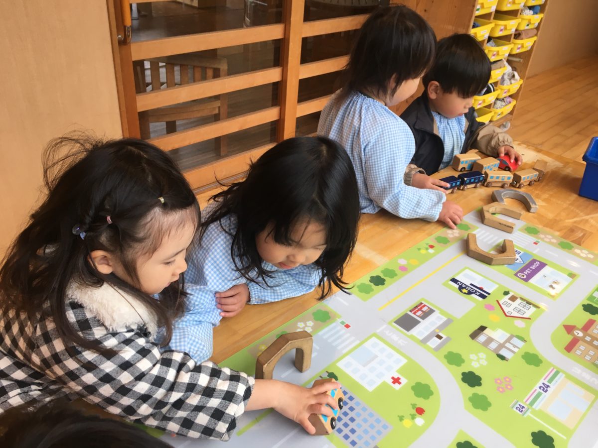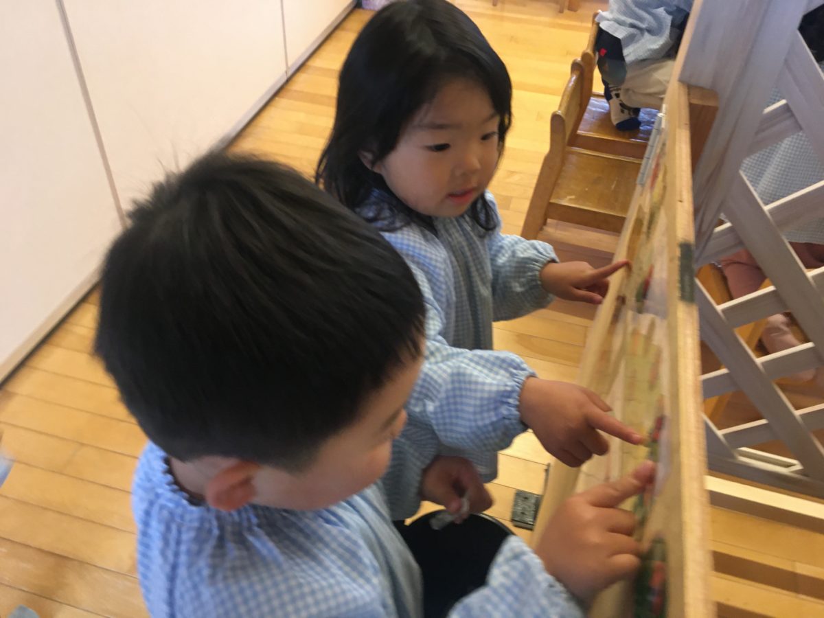積み木やおもちゃを使って高く積む遊びを楽しむ姿が多く、東京タワーなど色んな建物の写真を貼っておくと「これとうきょうたわー!」「このしろいのはみたことないなー。」と写真を見ながら話していた子どもたち。すると急に積み木のある場所は向かっていき、積み木をどんどん積んでいき…高ーく積むと「よし!とうきょうたわーできた」と写真を見てイメージをわかせて作り始めたようでした。どんどん積んでいくと自分の身長よりも高くなり「どうやってしたらつめるかな?」と考えたりお友だちと協力しながら作る姿がありました。ブロックでも高く繋げていた子が「どっちがたかいか、たかさしょうぶしてみよ」と横に並べてみると「どっちもたかくなったよね!すごいね!」と比べるつもりがどちらも高くなったことを喜び合う姿がありました。りんご組さんは掲示板を見ながら「てんとうむしや」「いっぱいおるね。1,2,3,...10」と順番にてんとう虫を数え何匹いるか数える子どもたちの姿がありました。するとさらに興味を持ったのが…「このきいろいなに?たまごかな?」とテントウムシの卵に興味津々。「たまごはきいろなのに、てんとうむしはあかだね!」と話していて、卵から幼虫にはならず、テントウムシの形で生まれてくると思っているようでした。また違うテーブルでは、お相撲さんづくり♪小さな紙でも丁寧に1つずつ折っていく姿があり、作った後にはお友だちと対決をするなど作ったものを使って遊ぶ姿もあり大切に使って楽しむ姿がありました。