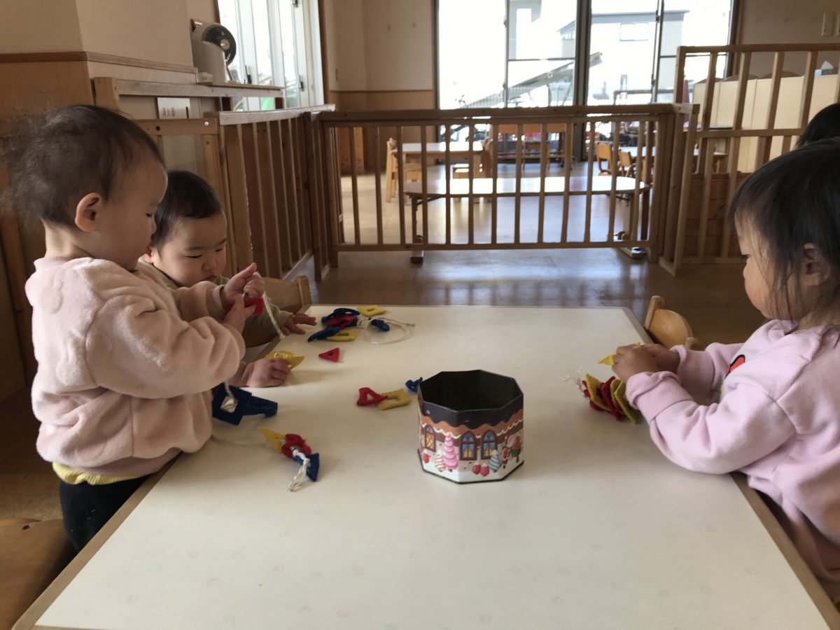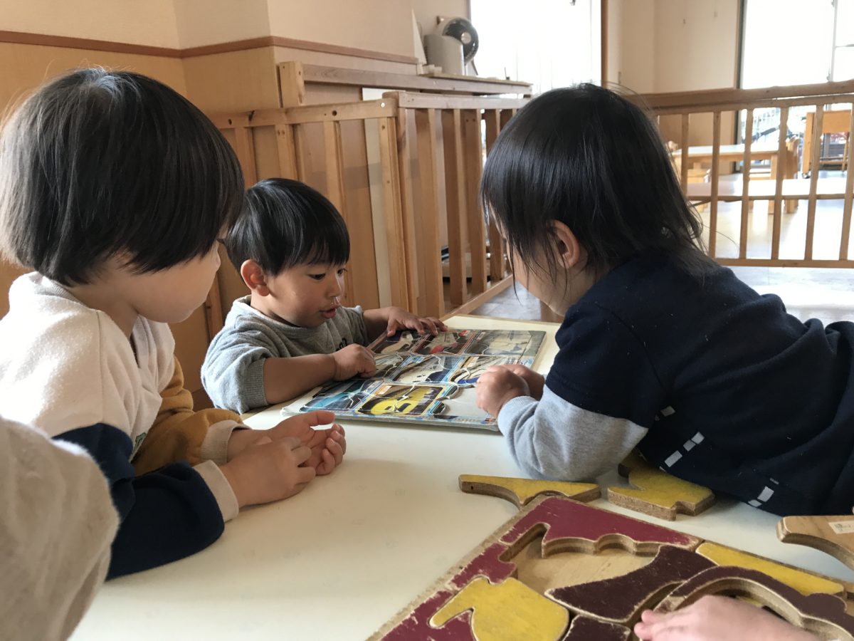 お部屋で遊んでいたお友だちは、すいか組さんと一緒に紐通しをしていました。なかなかうまく通せないすいか組さんはいちご組のお姉さんたちの姿を見て一生懸命通そうと何度も挑戦している姿があり、1つ通せると嬉しそうに次々通していました。パズルをしていたお友だちは、新幹線の写真が載っているのを見つけると「これ!」「あー!」とパズルを指して「知ってるよ!」とお友だちと話して楽しんでいました。