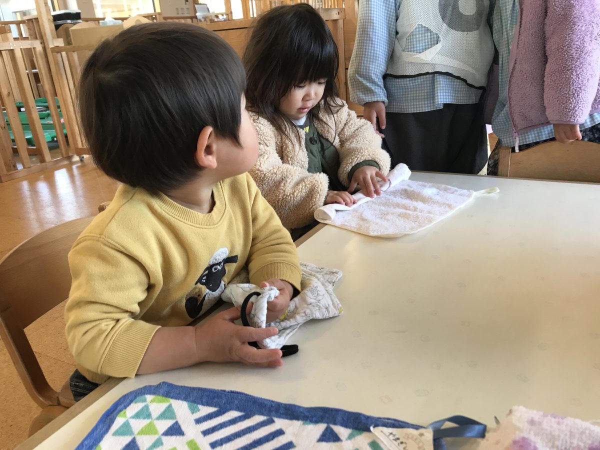 保育士がタオルを畳んでいるのを見ていたお友だち。「これぼくの!」「これわたしの!」と自分のタオルを見つけると机の上でたたんでお手伝いをしてくれました。
