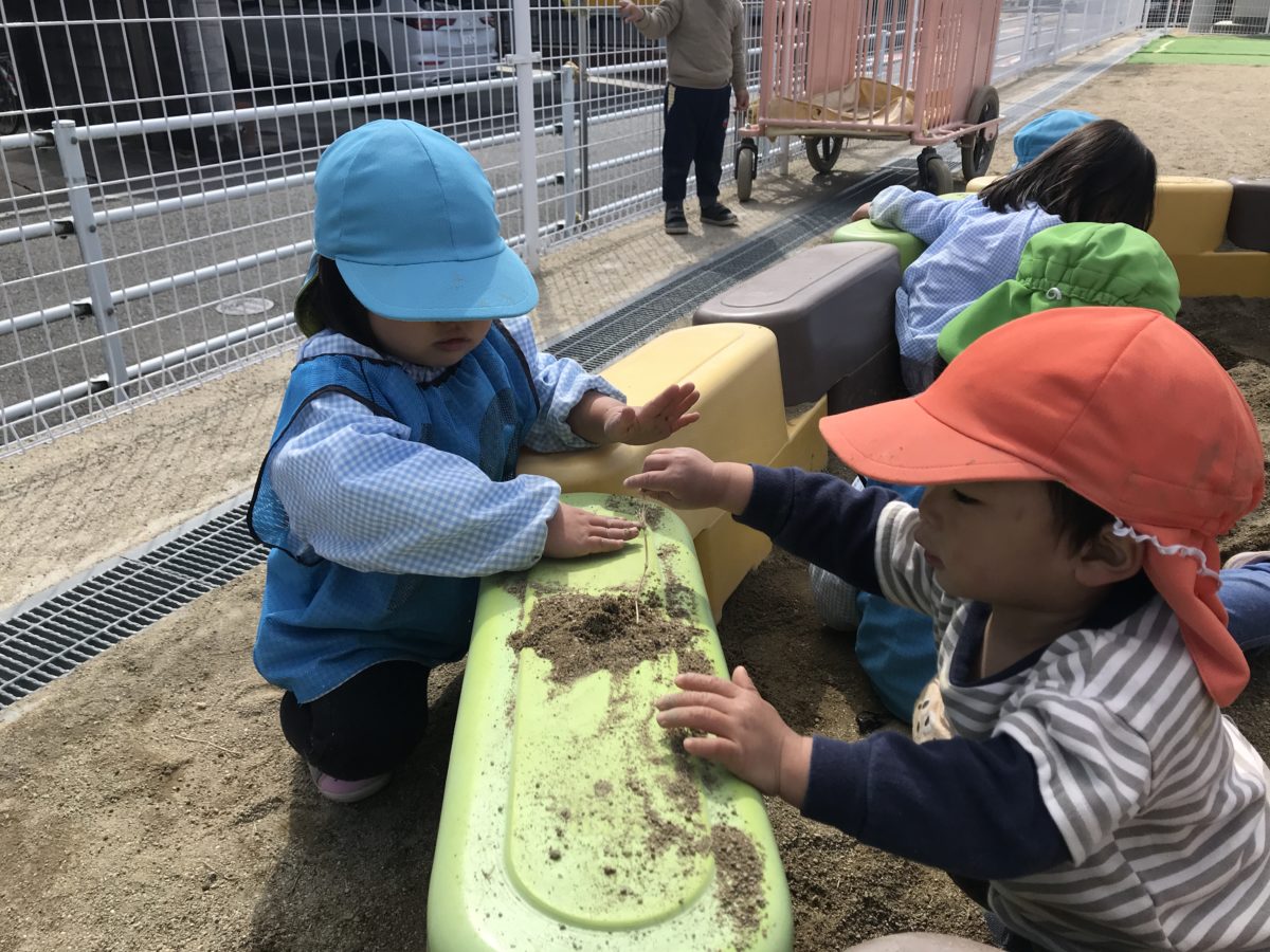 「ガタンゴトン!電車でーす!」砂場の枠に座って電車ごっこをしていたお友だち。みんなで一列になってグルグルと回っていると「うしろきてー!」と引っ付いて1つの電車になろうとしていました。全員が引っ付くと「しゅっぱつしまーす!」とまた列車を発進!何周かして楽しんだ後は、お姉さんたちと一緒にお砂を集めて山づくりを始めました。「ここに集めてね!」「うん!」とやり取りをしていると「チョコレートみたい!」「チョコレート屋さんだね」と山づくりからチョコレート屋さんに変わっていき、砂を少しずつ集めると「チョコたくさん!」と喜んでいました。