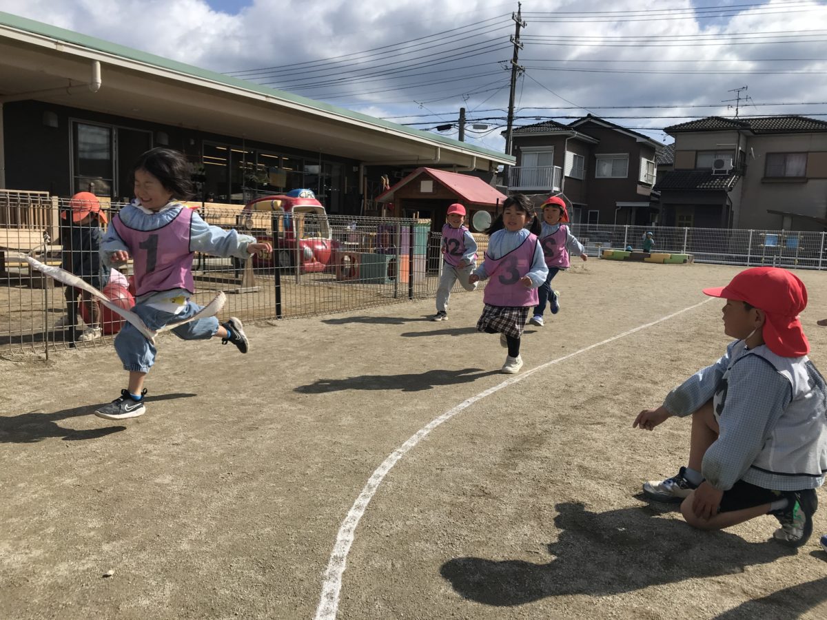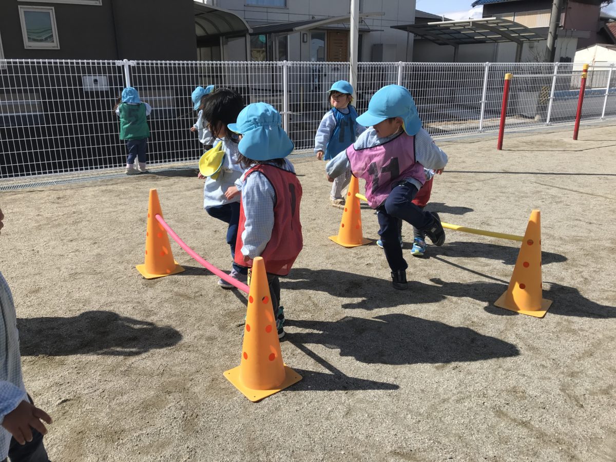 今日はかけっこをゴールテープを出してやってみました。ゴールテープを切ってみたい子が多いようで、「あれでゴール!ってしたい!」「ぼくがするんやし!」「負けやんし!」と言いながら1位を目指す子ども達。「やったー!ゴール!」とゴールテープを切ると大喜びでガッツポーズを取る子も居て、かけっこへのやる気を感じました。大きい子のその姿を見ていたりんご組のお友だちも「やりたーい!」「あれするの~。」と言いながら自分たちで「よーい、ドン!」と走っていく姿があり、ゴールすると、「やったー!ゴールちた―!」ととても嬉しそうに話す姿があったり、「みてみて、3人で走れるよ!」と走りながら楽しそうに手を繋いで走っていたりしました。またハードルを出しておくと、自分たちで高さを調節したりしながらハードル遊びも楽しんでおり、りんご組のお友だちも走ったり、跳んだりの運動遊びを楽しんでいました。