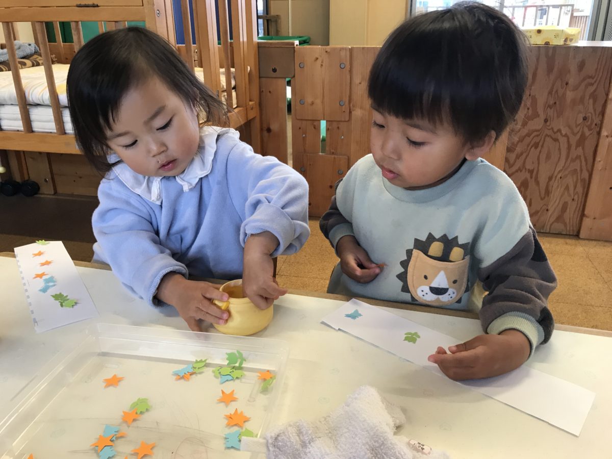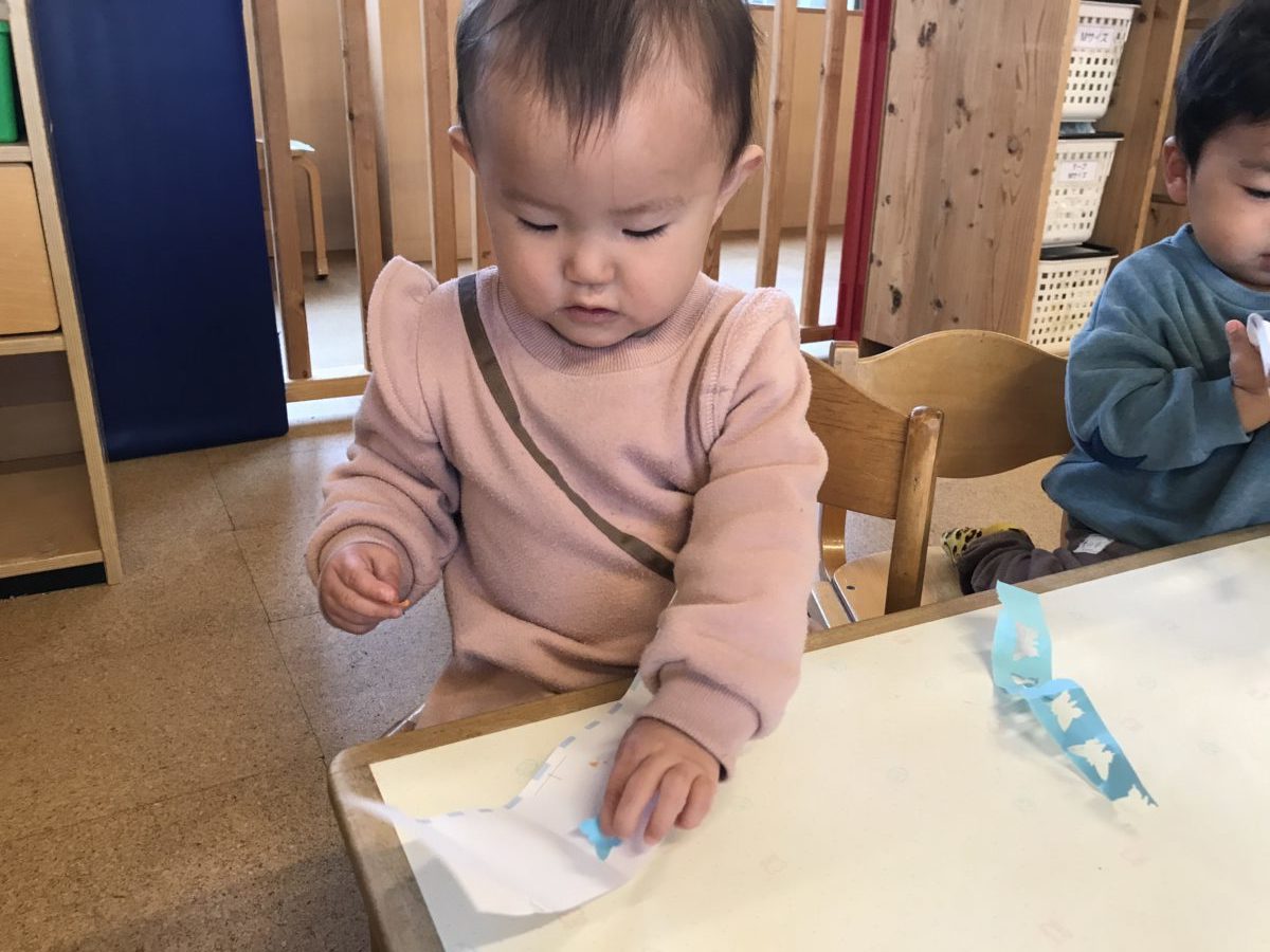 乗り物の大きな絵本の運転席のページになると、みんなで色々な乗り物の名前を言い合っていました。「きゅうきゅうしゃやー」という子がいたり、「ちがうよ、しょうぼうしゃだよ」と真剣な表情で話している子もいました。正解は、消防車でした、運転席を見ただけで分かるなんてすごいですね。乗り物が大好きなんですね。また、違う机では、のり遊びを始めると、ずーっと集中して貼っている子がおり、次に来た子に「こうだよ」と貼り方を教えてあげていました。貼り終えた子が、今度は紙を丸め出し、その丸めた先にのりを貼って望遠鏡のような長いのを作っていたのにはびっくりしました。自分で考えていろんなことが出来るようになりましたね、成長を感じました。明日は何を作ろうかなあ。