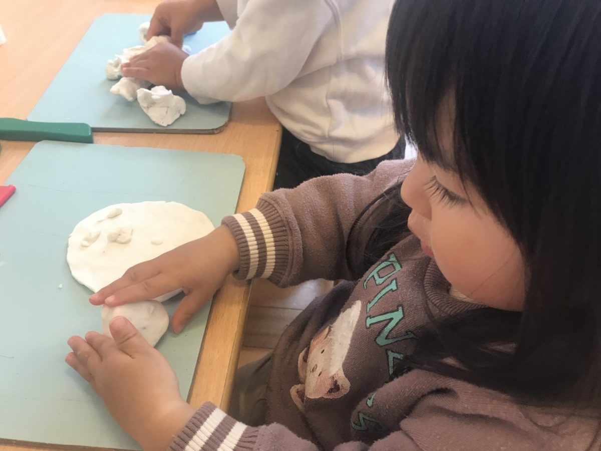 粘土で顔を作ったので、おにぎりを食べさせてあげていました。上手に、お顔を貼っていたのでびっくりしました。