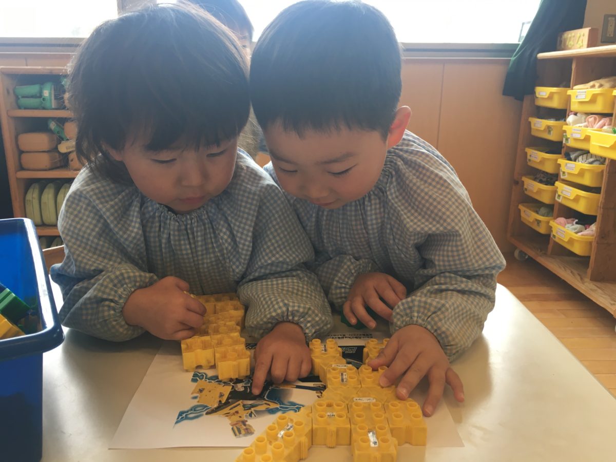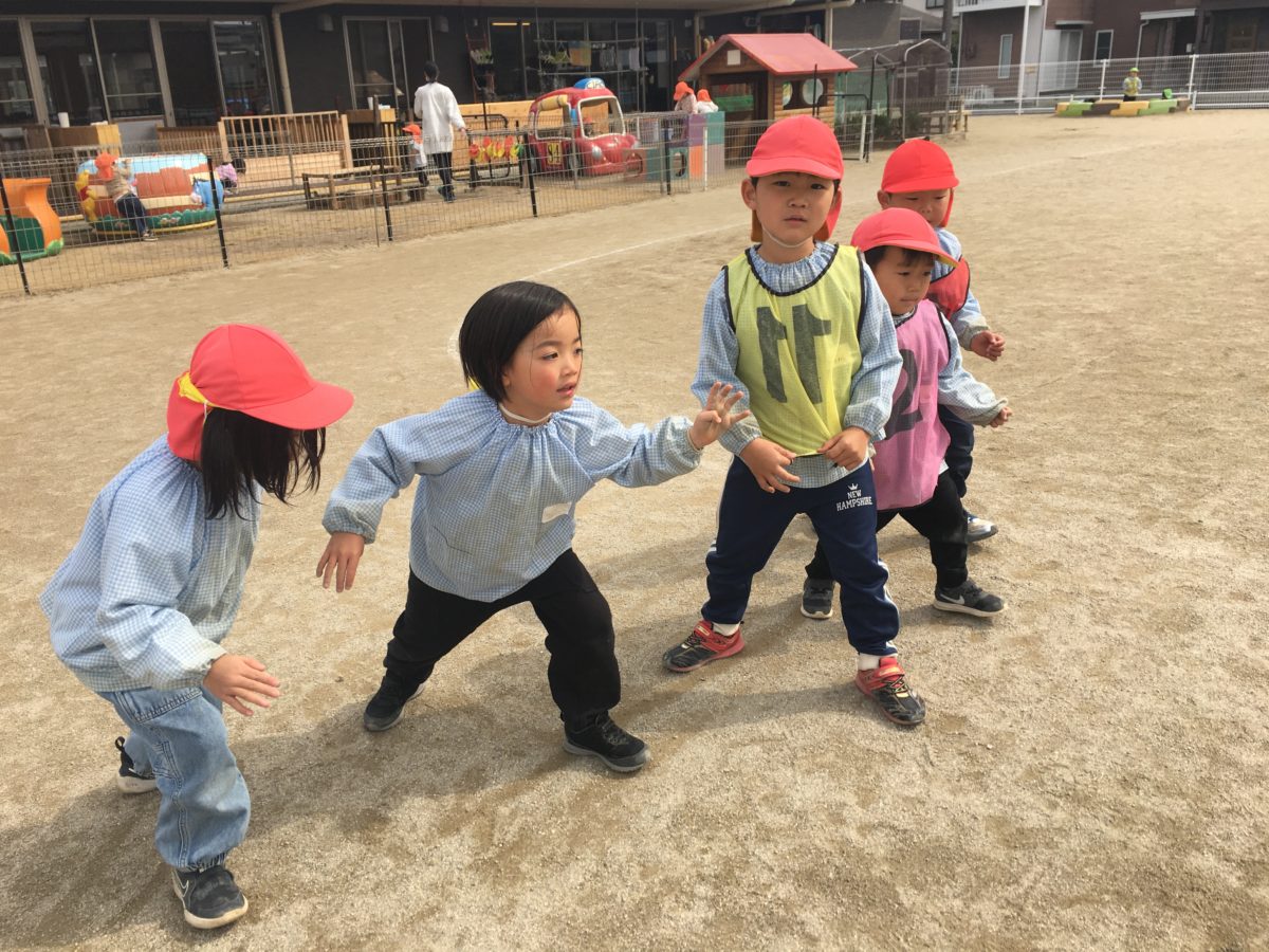 園庭では鬼ごっこを楽しんだ後にクラスごとにかけっこ対決!初めに4人ずつ進んでいったのを見て「つぎも4にんずついこう!」と次に走る子たちも4人が出てスタートラインへ並んでスタートを待つ姿がありました。そしてばなな組さんは走るスピードがみんな速くなりなかなか決着がつかないことも多かったため、今日はかけっこを2周バージョンでやってみました!子どもたちは「だれがかつかな?」「2しゅうたいけつやもんな。かちたいな」と走る前にやる気満々な姿がありました。またリレーも今日はいつもとは違うさくらんぼVSばななで対決してみました。さくらんぼ組さんも走るスピードが速くなった分、バトンを渡して受け取るところがスムーズにいかず、今日は少しの差でばなな組の勝ちでした♪するとばなな組さんも「なんかさくらんぼぐみさん、はしるのはやくなったよな。」と対決したことで実感したところもあり「ぼくたちもがんばらんとやな。」とさらにやる気が増した様子もありました。お部屋では以前からブロックで新幹線のロボットを作っていた様子があり、今日は新幹線の写真やロボットの写真を準備すると「このでんしゃはなーんだ?」と電車の名前当てクイズが始まり交代で問題を出し合うような姿があったり、りんご組さんも違うブロックでロボットを作って貼ってあった写真と見比べている様子もありました。