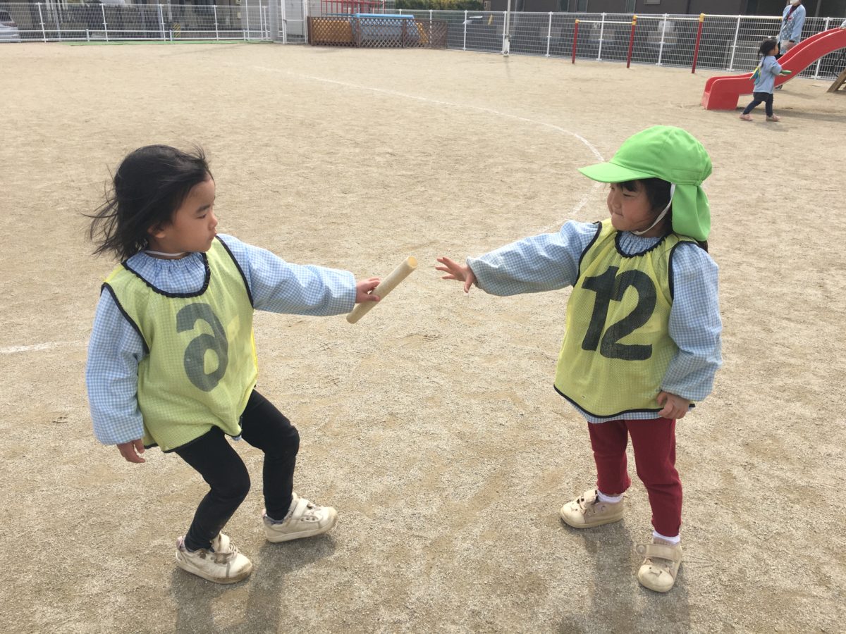 ばなな組VSさくらんぼ組でリレー対決!! つぎの子へバトンタッチ♪