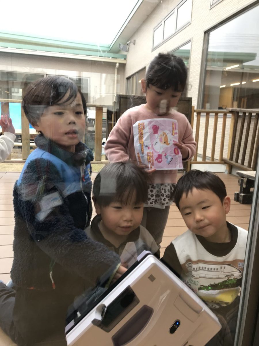 窓ふきのお掃除ロボットに興味を持ち同じ動きをしたり眺めたり・・・していました。その後雑巾を持ってきて窓ふきをしてくれてましたよ。
