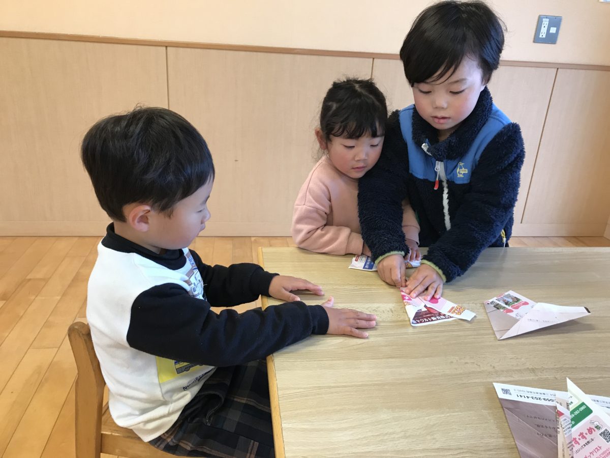 『紙飛行機が作りたいんだけど・・・できないんだ。』と困っているお友だちの会話を聞いていためろん組さんが教えに来てくれました。『どんな飛行機が作りたいの?』『速いの?』『曲がるの?』と、とっても熱心に聞いてくれていました。