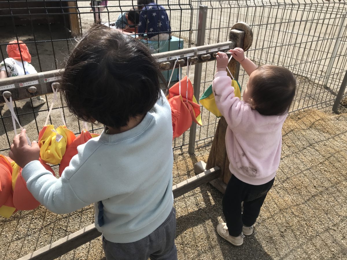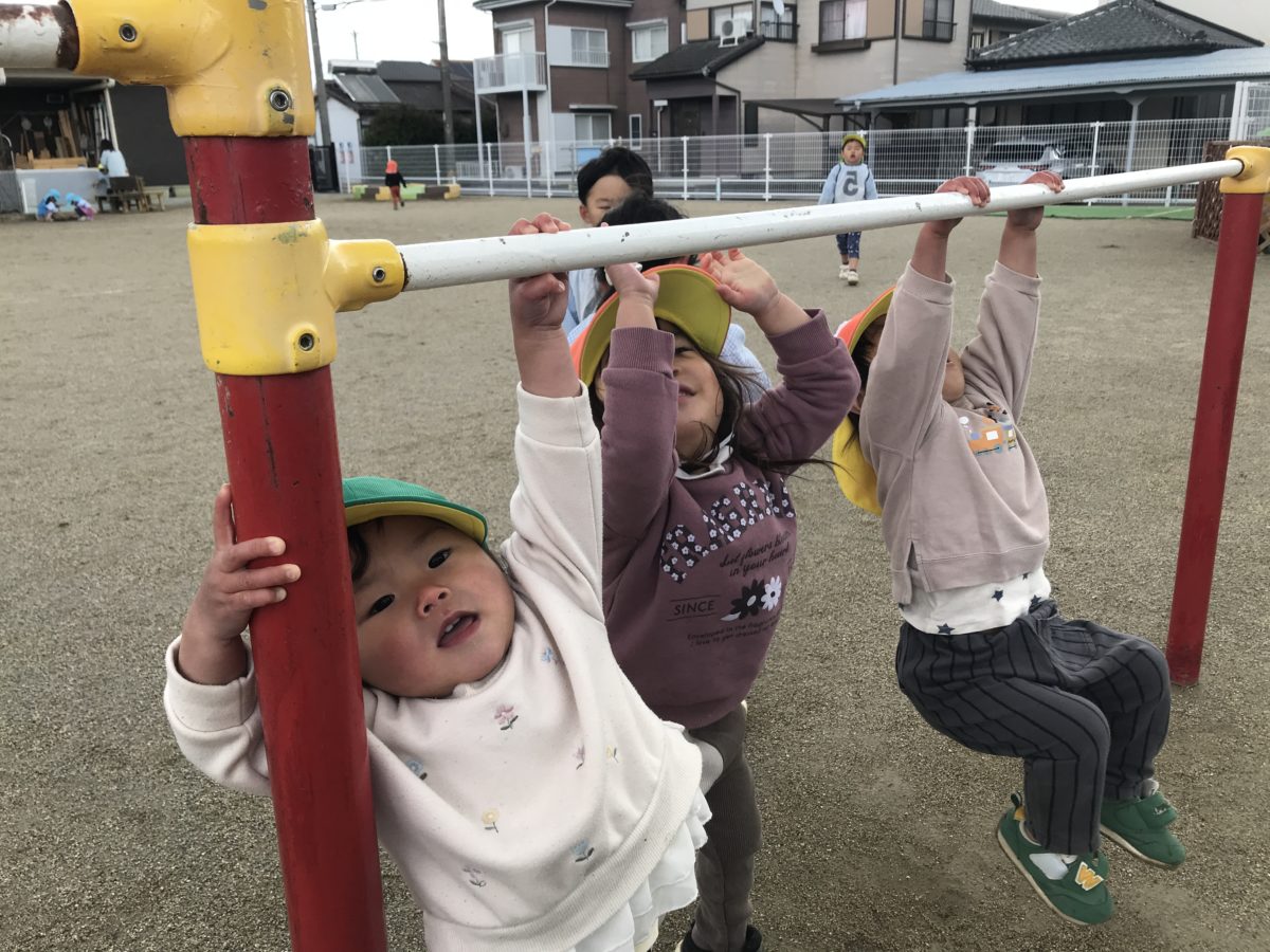 園庭では湿った土をギュッギュッと力強く踏んでその感触を楽しんだり、鉄棒にぶら下がったりそれぞれ身体をたくさん動かしながら元気いっぱい遊ぶ姿がありました。すいか組さんもいちご組さんの真似をして鉄棒に一生懸命手を伸ばしており、その様子を見て「だいじょうぶ?とどく?」といちご組さんが優しく声をかけて一番低い鉄棒を教えてあげたり、身体を支えてあげようとする様子が見られました。また、園庭に行くために自分で靴を見つけて履こうとしたり、お部屋に戻る前に帽子や靴を片付けたり姿があり、いちご組さんと一緒に過ごす中で真似をしながら自分でできることがどんどん増えてきました。