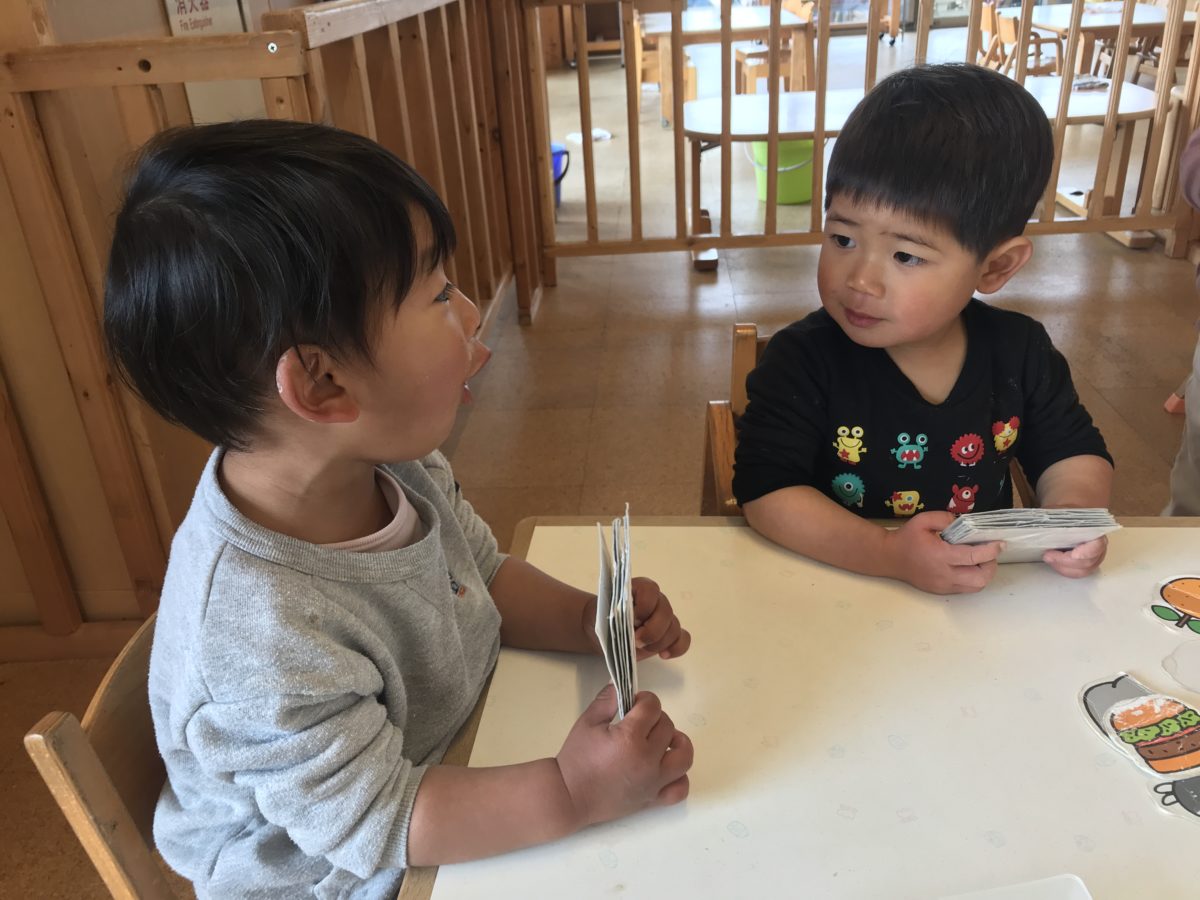「これな~んだ!」「バス?」「ちがうよ?でんしゃ!」お友だちと乗り物や動物の名前クイズを出したり、カードを交換したりして楽しんでいました。