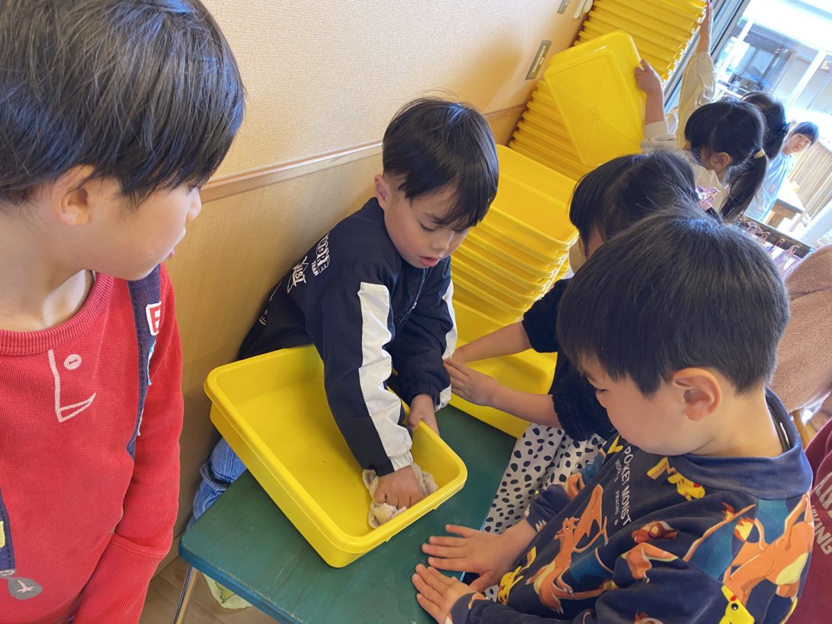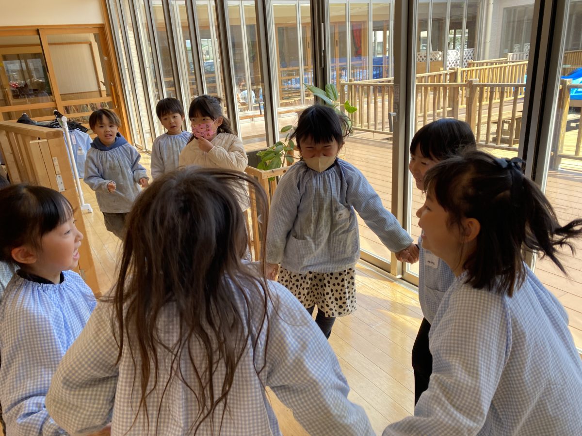 今日も昨日の続きで卒園にむかって自分の荷物の整理をしました。習字で書いたお気に入りの作品も一緒にしまったり、使っていたお道具箱の掃除も角と角に気を付けて丁寧に拭いてくれていました。こっちにつんでこう!と役割分担してお友だちと協力していました。また残り少なくなってきたみんなと一緒に過ごせる日々を大切に思いながら、保育園で楽しかったことや嬉しかったこと、悔しかったことをみんなで振り返った後、一人ひとり印象に残ったことを発表してくれました。「えんそくのおにぎりがとても、うれしかった!」「のりがきらいやけど、えんそくのおにぎりののりはたべれた!」「〇〇くんとなかよくなれて、うれしかった!」「なわとびが〇〇かいとべてうれしかった!」「てつぼうにすわれるようになって、うれしかった!」「おとまりほいくのとき、〇〇ちゃんといっしょにねれてうれしかった!」「〇〇くんと〇〇くんがすきだった!」ドキドキしたり自分が話せるタイミングをはかって話したり、恥ずかしくてさっと話して座ったり、みんな個性を出しながら素直な思いを話して、お友だちの話を耳で目でしっかり聞く姿は今までのお友だちとの関係を思い出させるぐらい素敵なものでした。たくさん保育園で嬉しかったことをみんなで共有しながら最後外遊びに出る際にはハイタッチ!などいつも以上にスキンシップを喜んでお友だちとの関係を深めていました。卒園式、楽しみだね!早くお家の人に見てもらいたい!という思いの声も聞こえてきていました。