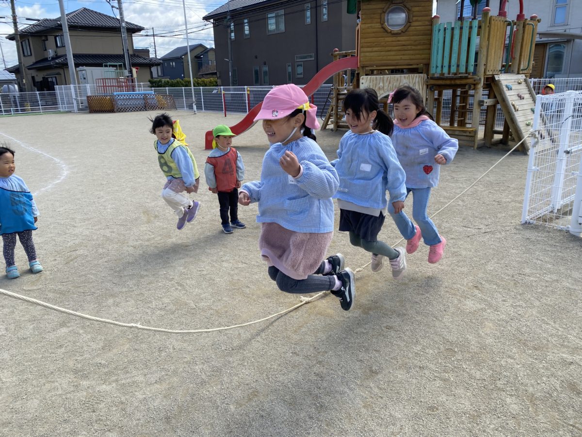 三人で力を合わせて、大繩でジャンプ!!息を合わせて、素敵な笑顔が見られました。
