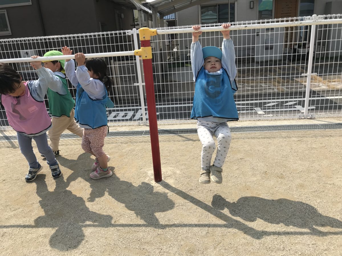 最近鉄棒にぶら下がって遊ぶりんご組のお友だち。ぶら下がりながら足を広げてみたり、ブランコのように揺れてみたりして鉄棒を楽しむ子が居ます。それを見ていた他のお友だちが、「すごーい!やってみたーい!」と一緒のように挑戦!中々ぶら下がりながら足を上げるのは難しいようで、「こんなに足上がらーん!」と何度も挑戦してました。そのうちばなな組の大きい子がやってきて、ひょいっと足を上げて「ぶたのまるやきー!」と見せてくれたりするのを「すごーい!」と感心して楽しんでました。