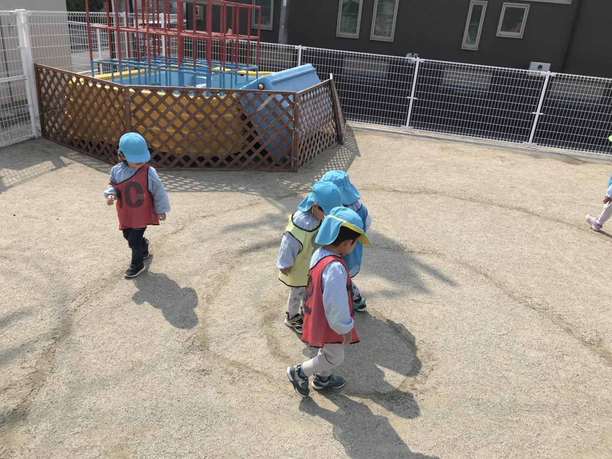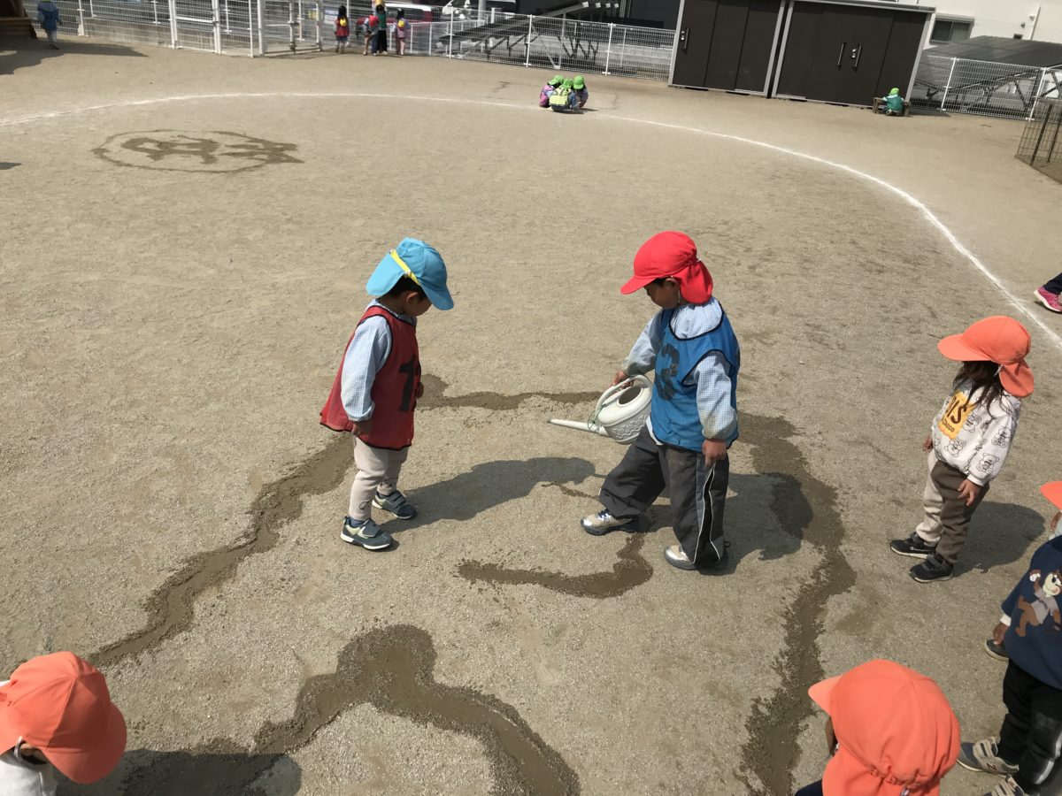 今日は昨日同様園庭に線を引き、迷路のように線を引いていると、「ぼくも水で線描いてみたい!」と楽しそう話す姿があったので、ジョーロを渡して挑戦!「結構水って重いんやな。」と話しながら、「大きい電車を書いてみたい!」と一直線に線を描きだし、その後に四角になるように線を描き進めていると、周りで見ていた他のお友だちも、「すごーい!大きい電車だー!」「電車乗ったー!」「本物の電車と同じで大きい!」と大喜びでお友だちが描いた電車の絵の上に乗ってみたり、自分の自身が電車になり切って進んでみたりしながら園庭に描いた電車を楽しんでました。鉛筆を使って描く絵と水を使って描く絵では描きやすさがまったく違う事を知ったようで、「こんなに難しいんやな!」と関心をする姿がありました。