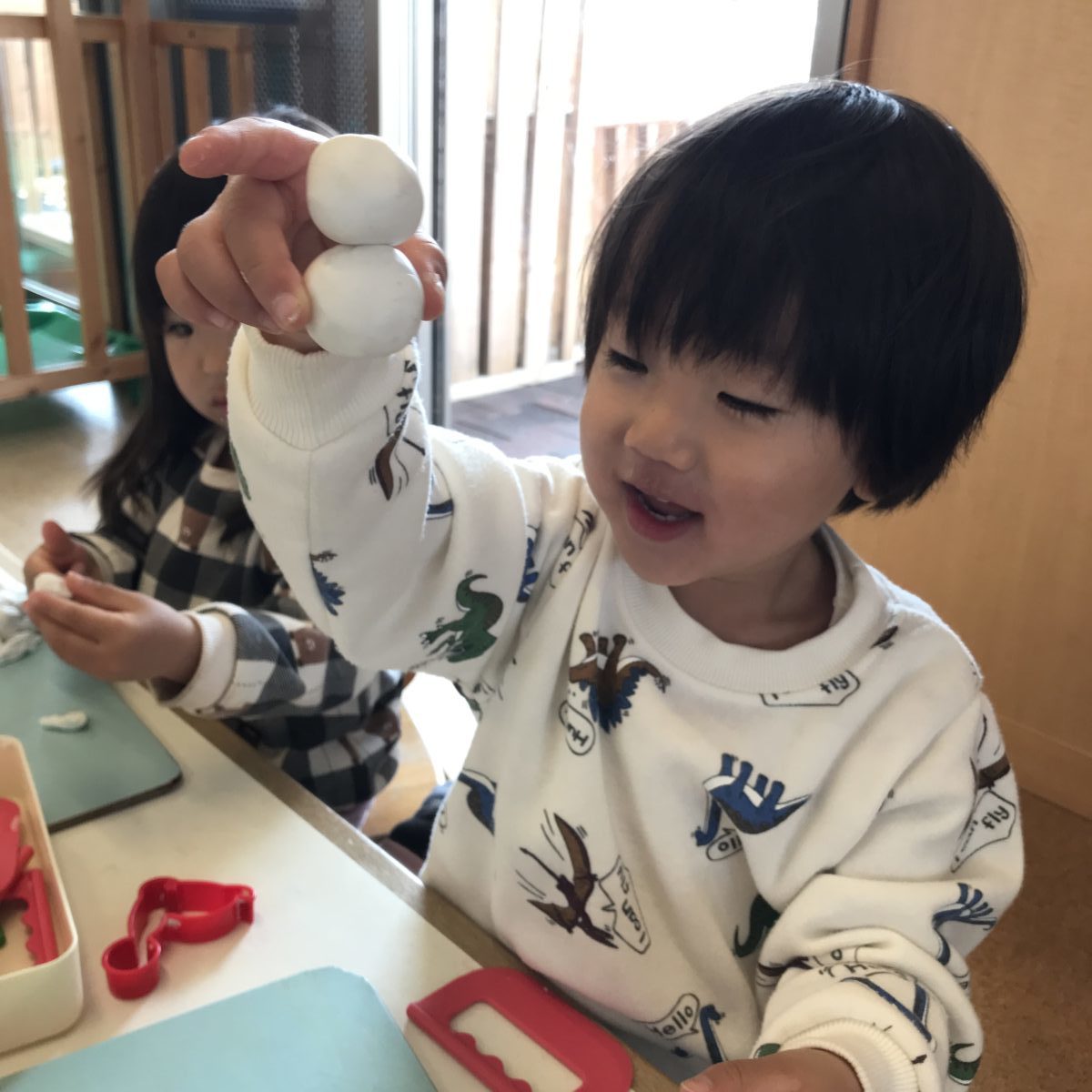 粘土を丸めたものをくっつけて「雪だるまー!」と見せてくれました。手で色々な形に変身させて見立てて作る姿がたくさん見られましたよ。