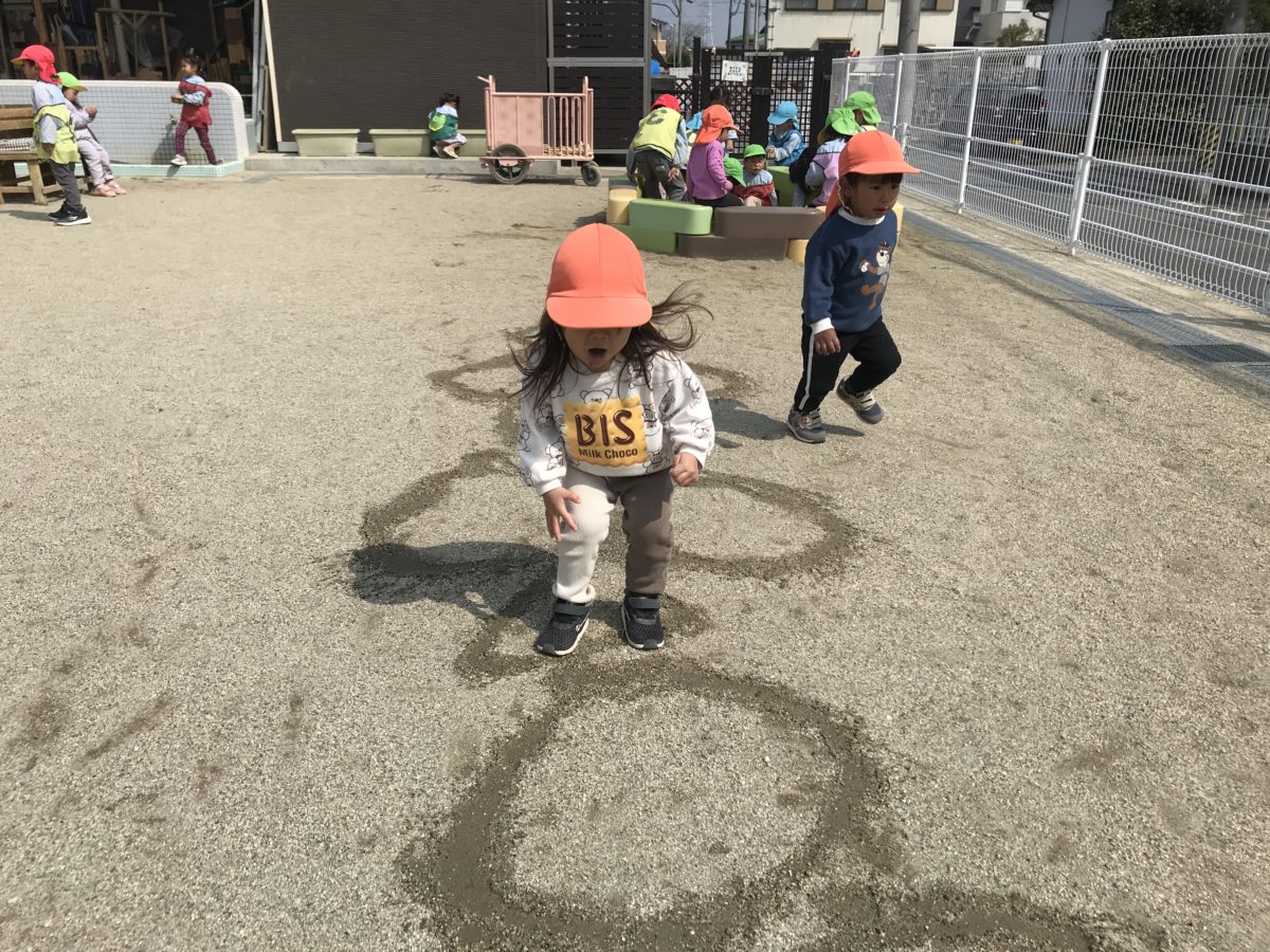 お外ではお兄さんお姉さんたちと一緒にケンケンパをして遊びました。ゆっくりジャンプしながら進んでいき、パ!のところは元気にパ!と丸の中に足が入ると嬉しそうでした。すべり台を楽しんだりして