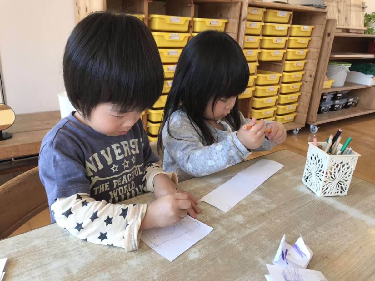 「なにか描きたい!」「ポケモンかく!」と紙に何を描くか考えていためろん組さん。「このタオルポケモンやん!」「ぼくのタオルそうやで!」と描きたい絵を見つけて描いていきます。「むずかしい…」と何度も書き直し上手く描けたものに色も塗って納得がいく一枚を完成させていました。ばなな組さんはひらがなで自分の名前を書いたり、アルファベットや数字の表を見ながら書いてみたり様々な文字に興味を持つ姿が見られました。小さいお友だちもお兄さんたちの絵を真似して電車を描いたり、絵に色を塗ったりじっくりお絵描きを楽しむ様子がありました。
