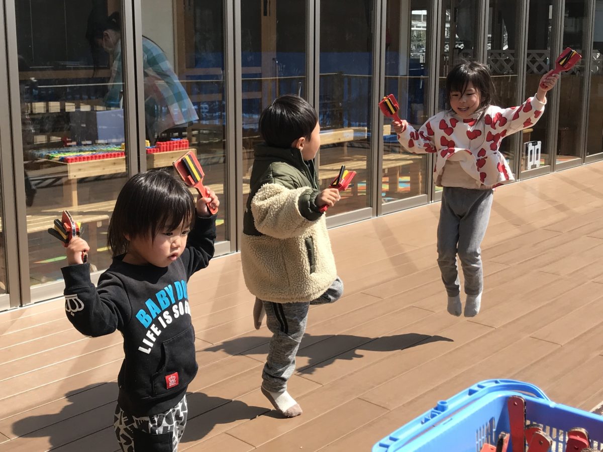 カランカランカラン♪鳴子でダンス!りんご組さんも歌に合わせて鳴らしています。