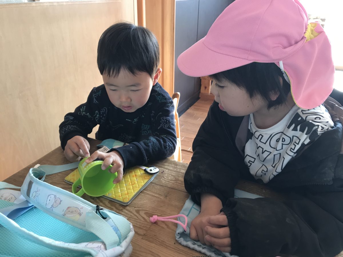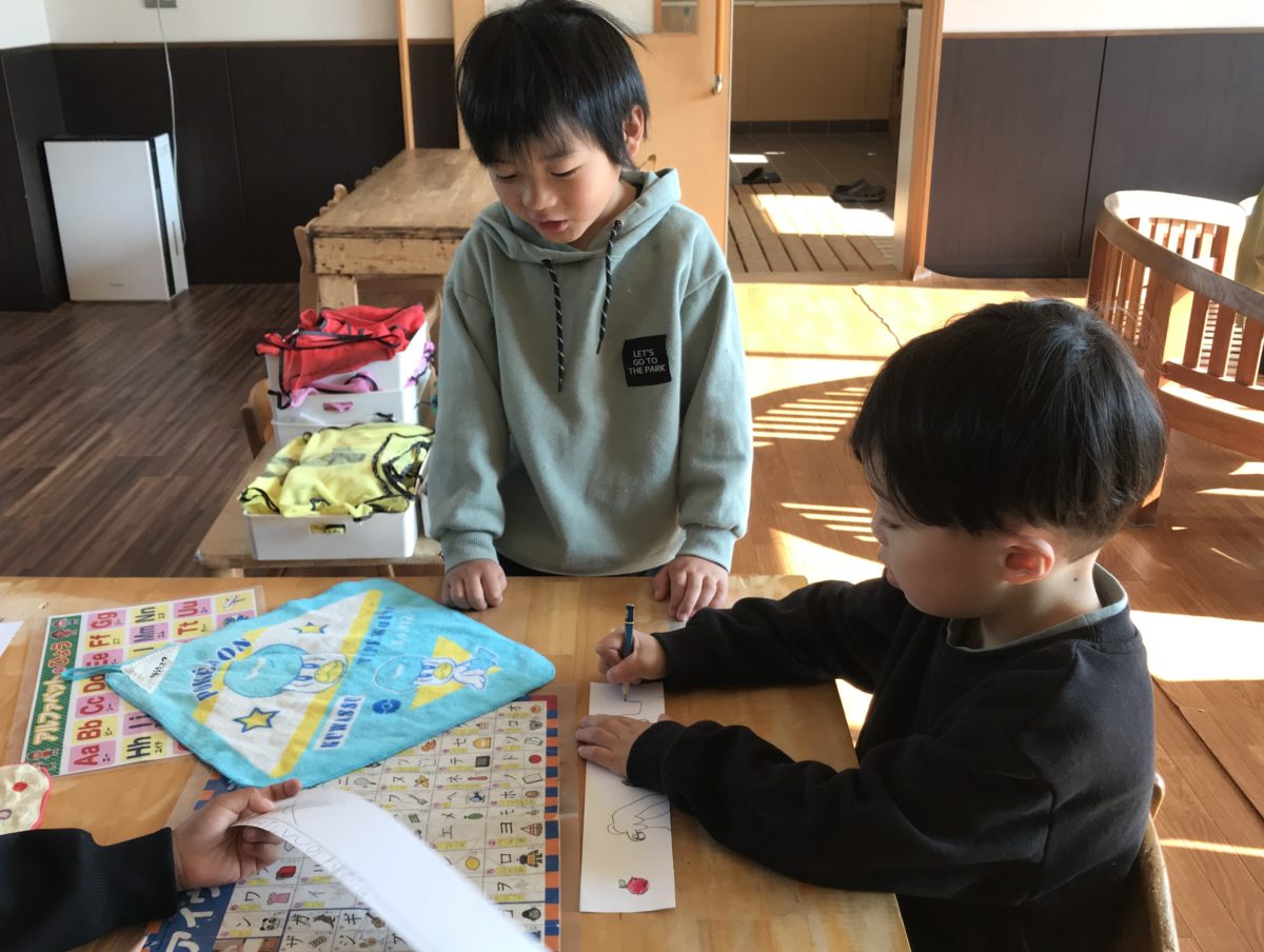 また、折り紙でカエルを作ることにしたお兄さんたち。「どこまでとぶか点数かく!」と紙を二枚つげて点数表を作り、「ここが、さいこうとくてんやで!」と一番上の点数を決めていました。みんな色々な大きさの折り紙で作って、それぞれ一番とぶカエルを選び…いざ勝負!順番にとばし、「○○くんここ!」「なまえかいとくわ!」とどこまでとんだか点数の横に名前を書いて記録していました。何度もとばして記録を更新し、そのたびにみんなで盛り上がっていました。自分たちで様々な材料や資料を使いながら、工夫して遊ぶ様子がたくさん見られました。